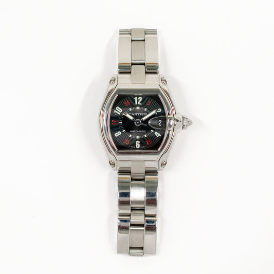 Silver-tone stainless steel case and bracelet. Fixed silver-tone stainless steel bezel. Silver-tone dial with black hands and Roman numeral hour markers. Minute scale around the inner rim. Dial Type: Analog. Luminescent hands. Date display at the 3 o'clock position. Quartz movement. Scratch resistant sapphire...- $3,000.00