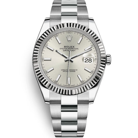 Movement: Officially certified chronometer self-winding movement.Jewels: 31Caliber: 3235Case: Stainless steel case 36.0 mm in diameter. Rolex logo on a crown.Bezel: 18K white gold fluted bezel.Crystal: Scratch resistant sapphire crystal with cyclops magnifier.Dial: Silver dial with raised roman...- $14,550.00