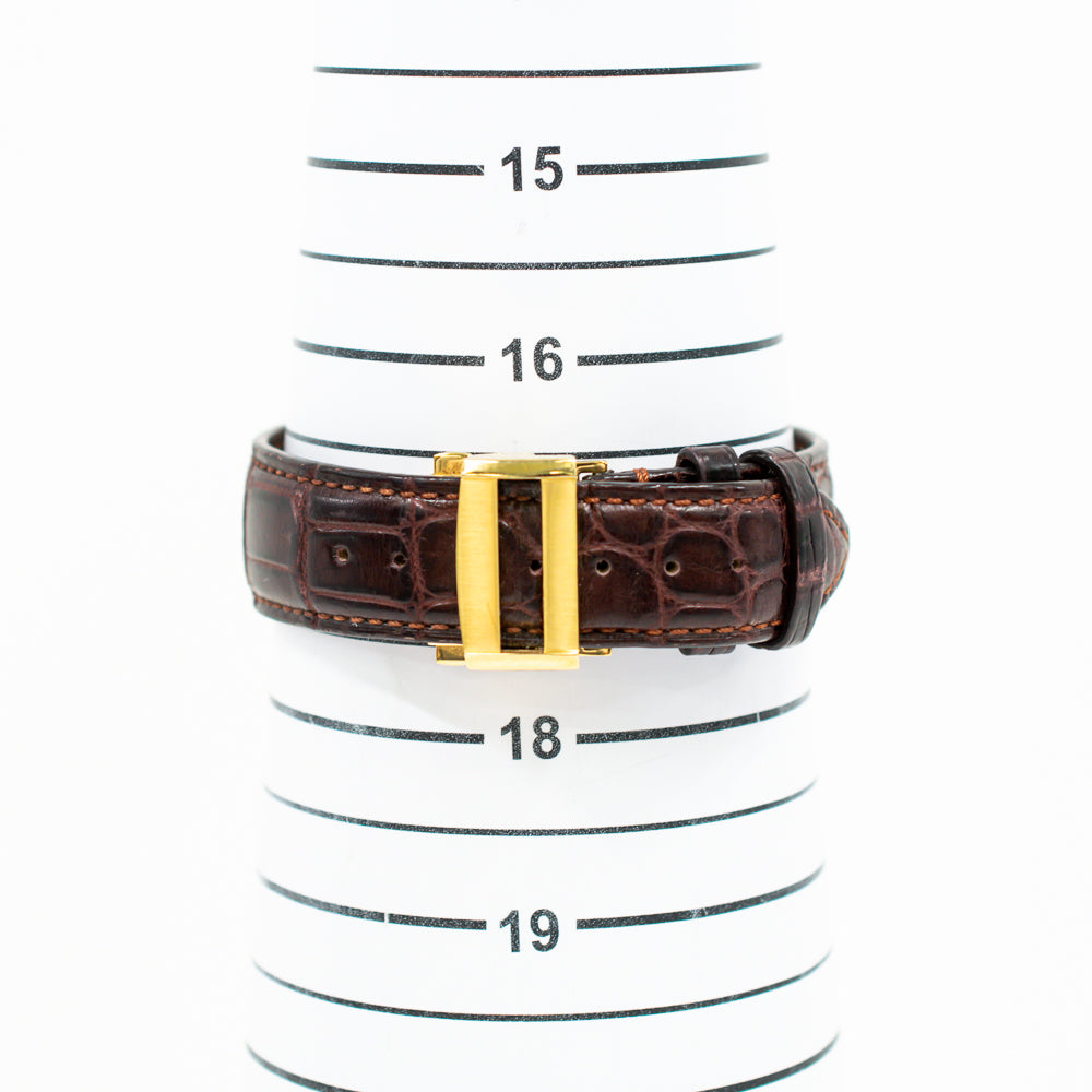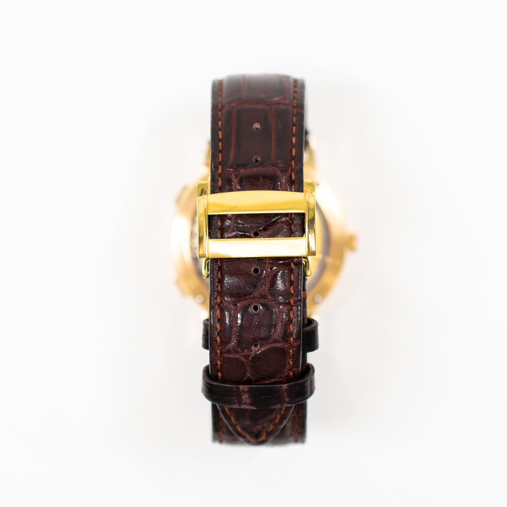 18kt rose gold case with a brown crocodile leather strap. Fixed 18kt rose gold bezel. Silver dial with rose gold-tone alpha-style shape hands and index hour markers. Minute markers around the outer rim. Dial Type: Analog. Two - 60 second and 24 hours (GMT) subdials. A. Lange & Sohne Calibre L086.2 automatic movement with a 72-hour power reserve. Scratch resistant sapphire crystal. Pull / push crown. Transparent case back. Round case shape, case size: 38 mm, case thickness: 9.1 mm. Tang clasp. Water resistant at 30 meters / 100 feet. Functions: GMT, second time zone, hour, minute, small second. Luxury watch style. Watch label: Made in Germany.