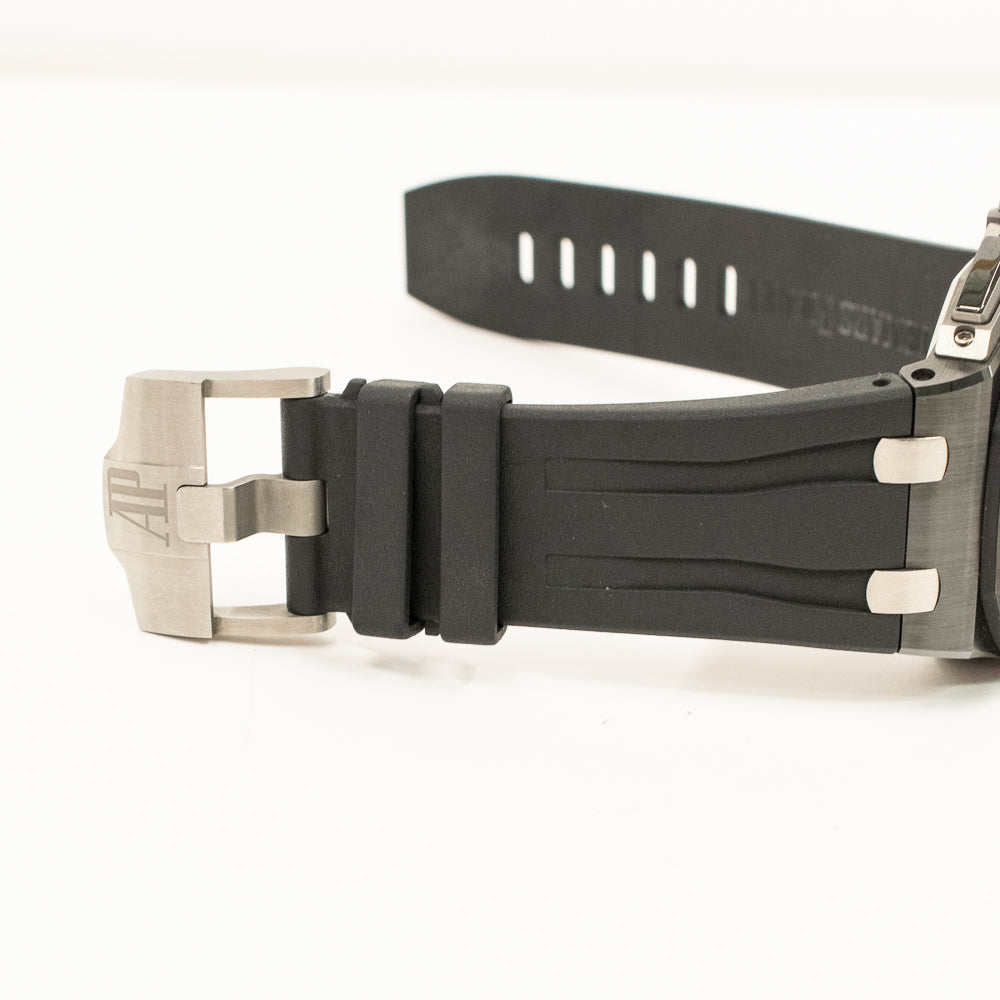 Black ceramic case with a black rubber strap. Fixed black ceramic bezel. Black with "Mega Tapisserie" pattern dial with white gold hands and index hour markers. Minute markers around the outer rim. Dial Type: Analog. Luminescent hands and markers. Date display at the 3 o'clock position. Chronograph - three sub-dials displaying: 60 second, 30 minute and 12 hour. Automatic movement. Scratch resistant glareproof sapphire crystal. Screw down crown. Titanium glareproofed sapphire case back. Case diameter: 44 mm. Case thickness: 14.45 mm. Round case shape. Titanium tang clasp. Water resistant at 100 meters / 330 feet. Functions: chronograph, date, hour, minute, second. Luxury watch style. Watch label: Swiss Made.