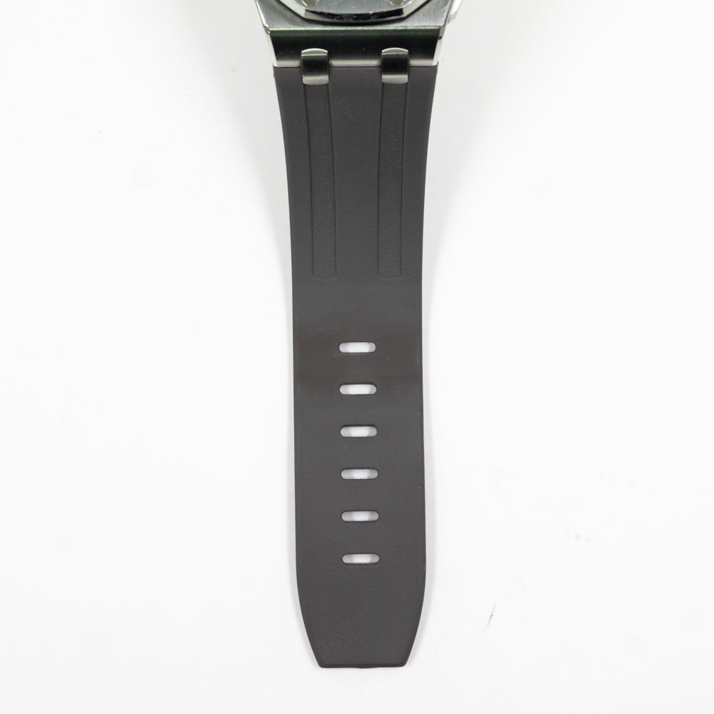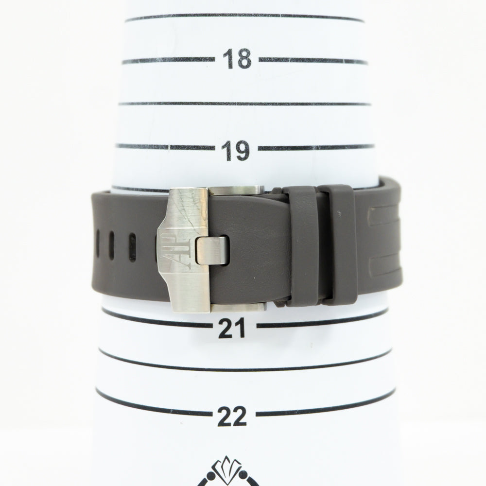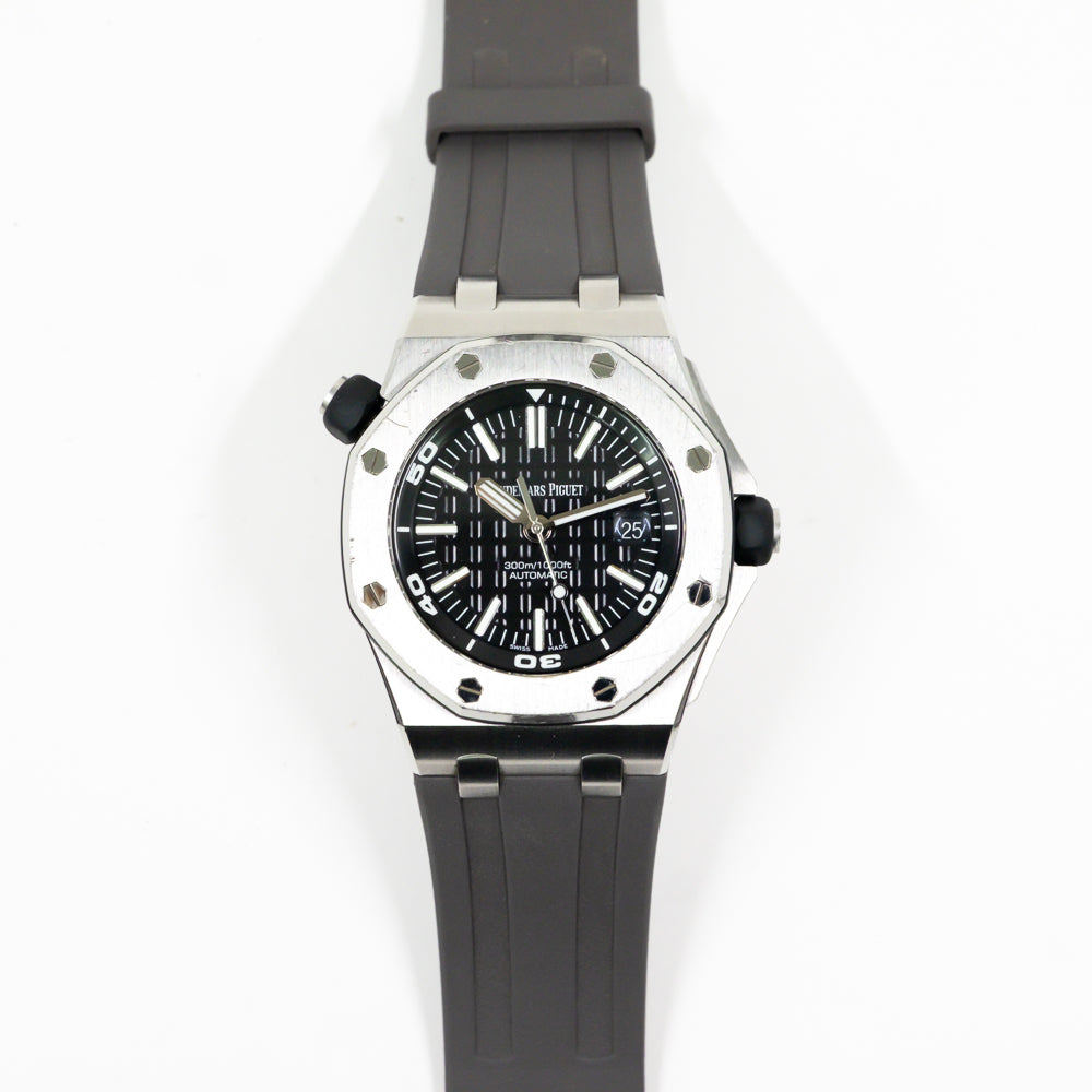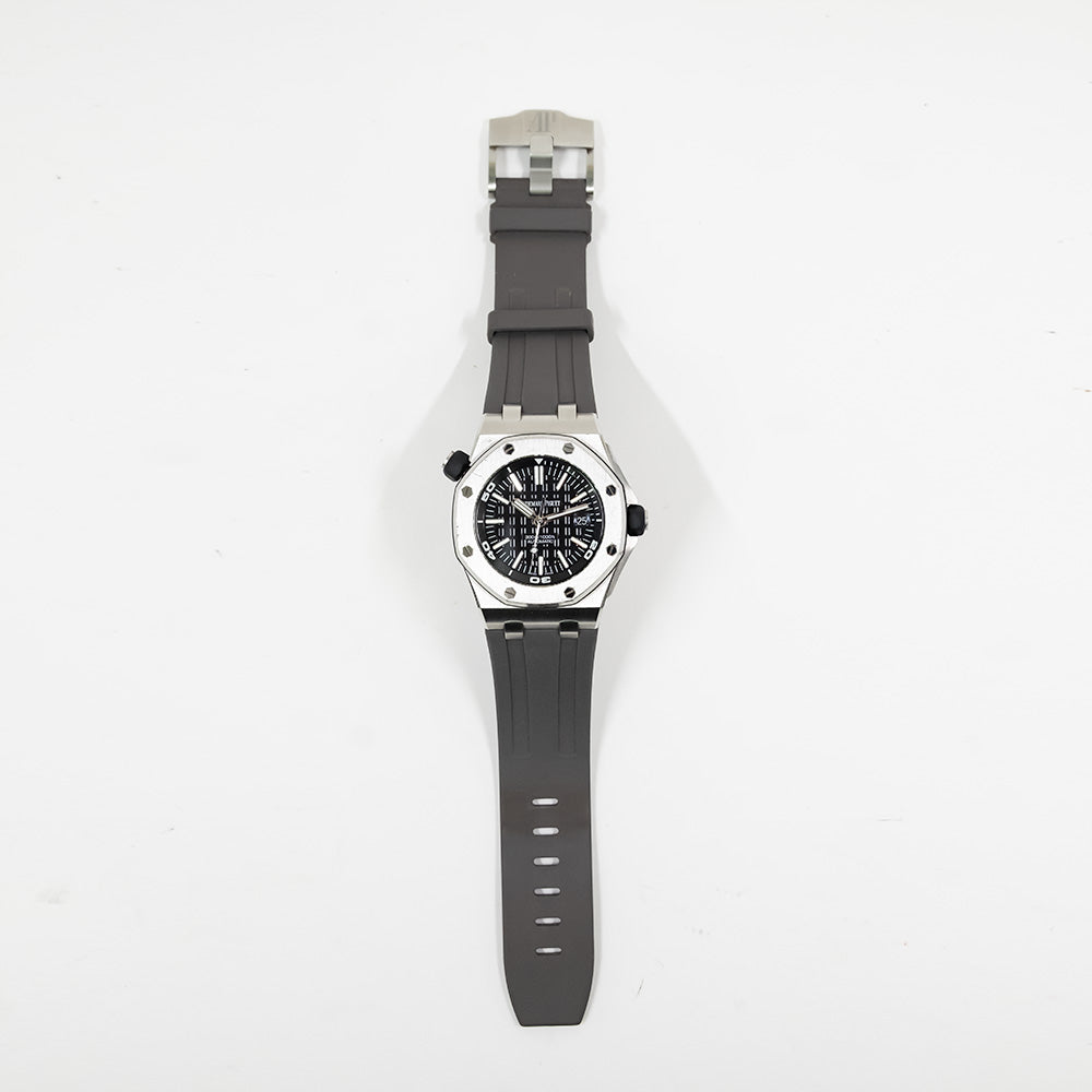 Stainless steel case with a grey rubber strap. Fixed stainless steel bezel. Black (waffle pattern) dial with luminous silver-tone hands and index hour markers. Minute markers around the outer rim. Dial Type: Analog. Luminescent hands and markers. Date display at the 3 o'clock position. Audemars Piguet calibre 3120 Automatic movement, containing 40 Jewels, composed of 280 parts, bitting at 21600 vph, and has a power reserve of approximately 60 hours. Scratch resistant sapphire crystal. Screw down crown. Skeleton case back. Octagon case shape. Case size: 42 mm. Case thickness: 14 mm. Tang clasp. Water resistant at 300 meters / 1000 feet. Functions: date, hour, minute, second. Royal Oak Series. Luxury watch style. Watch label: Swiss Made.