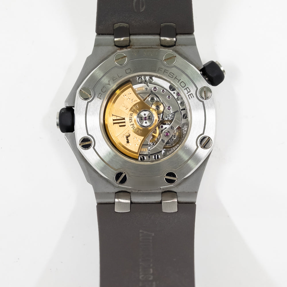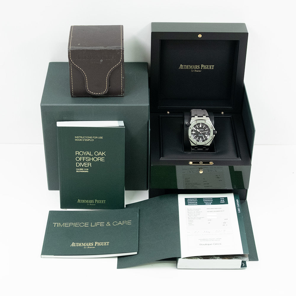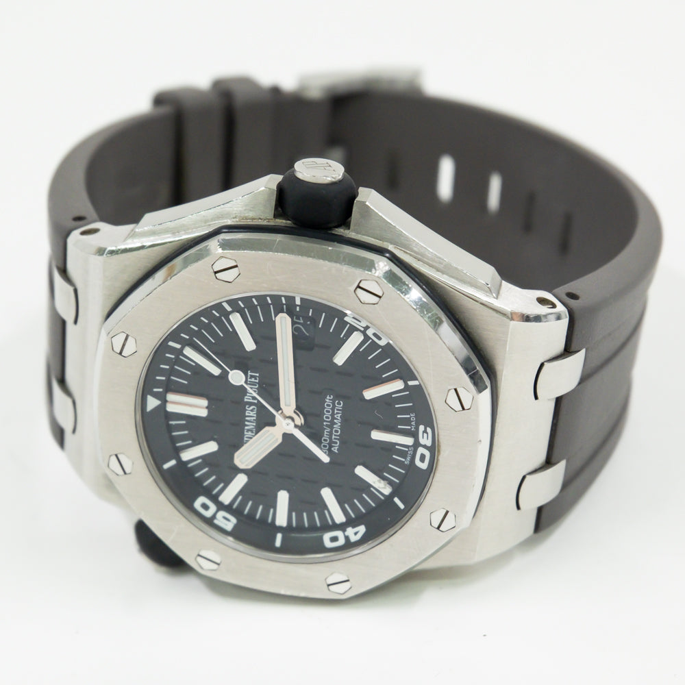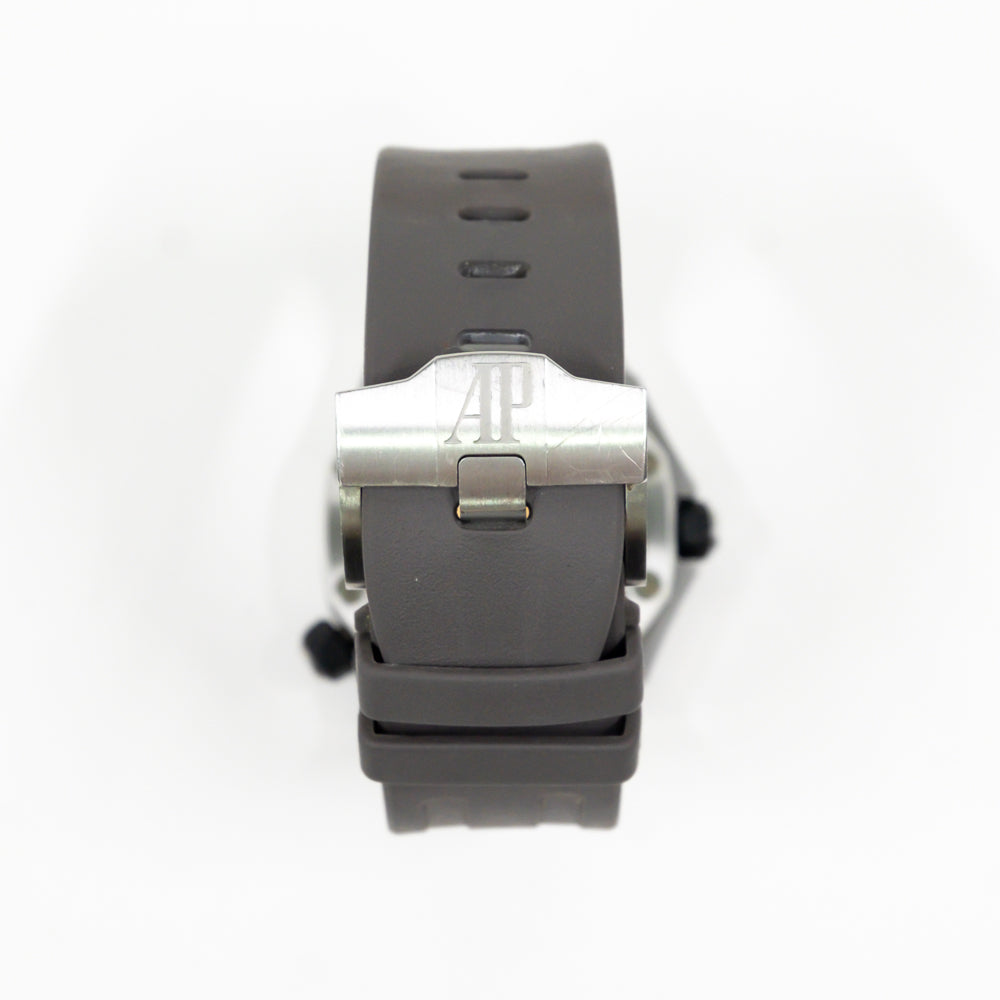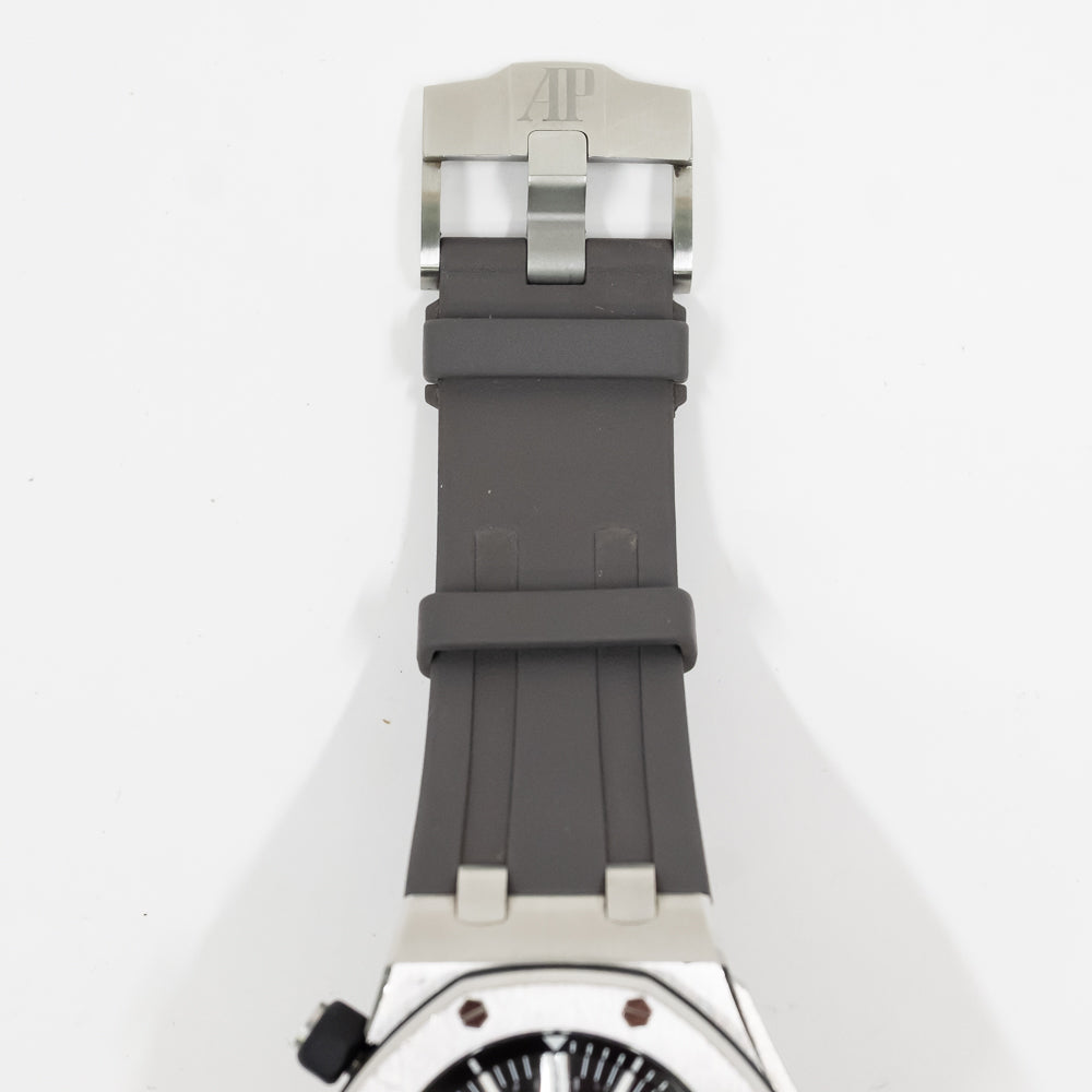 Stainless steel case with a grey rubber strap. Fixed stainless steel bezel. Black (waffle pattern) dial with luminous silver-tone hands and index hour markers. Minute markers around the outer rim. Dial Type: Analog. Luminescent hands and markers. Date display at the 3 o'clock position. Audemars Piguet calibre 3120 Automatic movement, containing 40 Jewels, composed of 280 parts, bitting at 21600 vph, and has a power reserve of approximately 60 hours. Scratch resistant sapphire crystal. Screw down crown. Skeleton case back. Octagon case shape. Case size: 42 mm. Case thickness: 14 mm. Tang clasp. Water resistant at 300 meters / 1000 feet. Functions: date, hour, minute, second. Royal Oak Series. Luxury watch style. Watch label: Swiss Made.