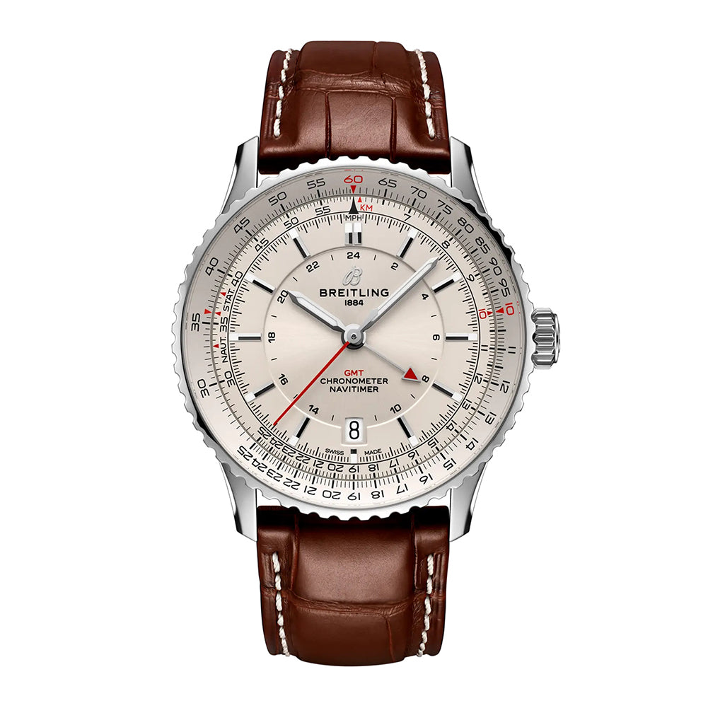 Breitling Navitimer Automatic 41 GMT Beige Dial Brown Leather Strap Men's Sports Watch Model A32310211G1P1. Brushed and Polished Stainless Steel case with Brown Alligator Leather Strap . Brushed Stainless Steel Folding clasp. Rotating bezel. Dial description: Luminous Silver Tone Hands and Stick Hour Markers with a Slide Rule and Minute Hour Markers Around the Outer Rim, a Central GMT Hand and Markers, and the Date at 6 o'clock on a Beige Dial. Swiss Automatic Chronometer. GMT movement. Calendar: Date at 6 o'clock. Chronograph sub-dials display: Date. Powered by Breitling 32 engine with 42 hours power reserve. Watch functions: Date, Power Reserve, Hour, Minute, Second, GMT, 24 Hour. Push-Pull crown. Scratch Resistant Sapphire crystal. Round case shape. Case size: 41mm. Case thickness: 11.6mm. Solid case back. 30 Meters - 100 Feet water resistant.
