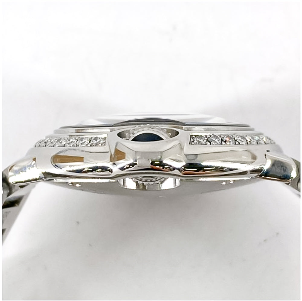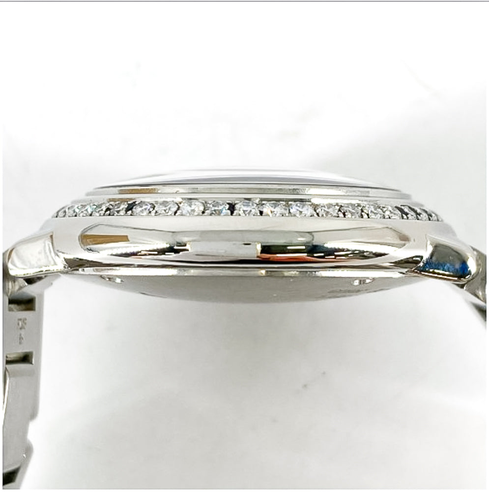 28mm stainless steel case, 9.35mm thick, crown set with a synthetic blue cabochon, bezel set with 42 diamonds (0.52 ct), sapphire crystal, silvered opaline dial with blued-steel sword-shaped hands, quartz movement, stainless steel bracelet. Water resistant to 30 meters.