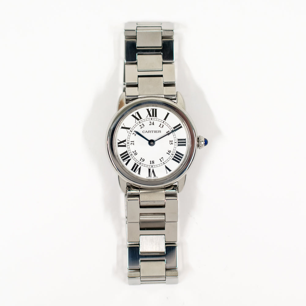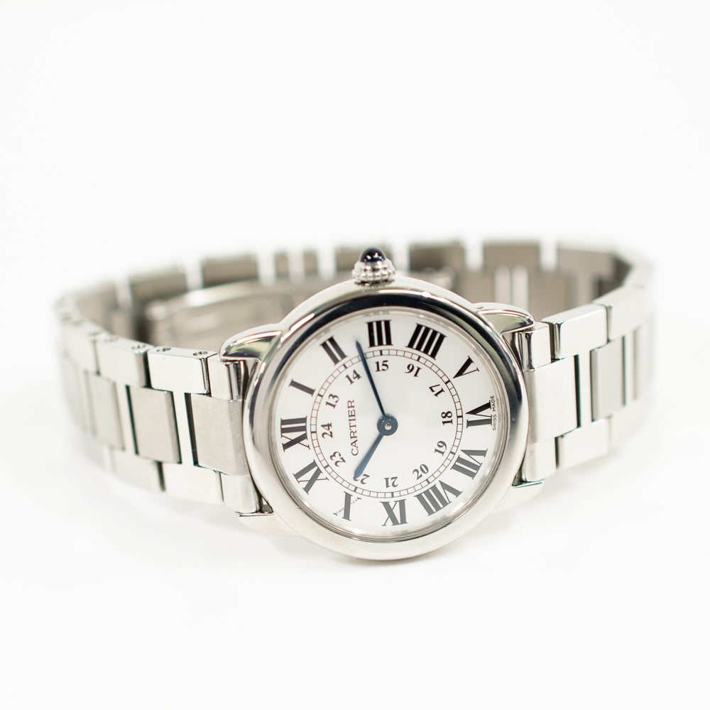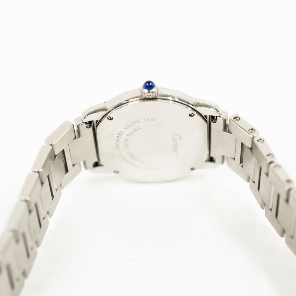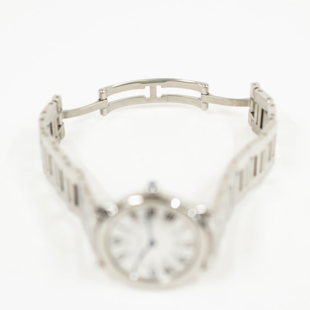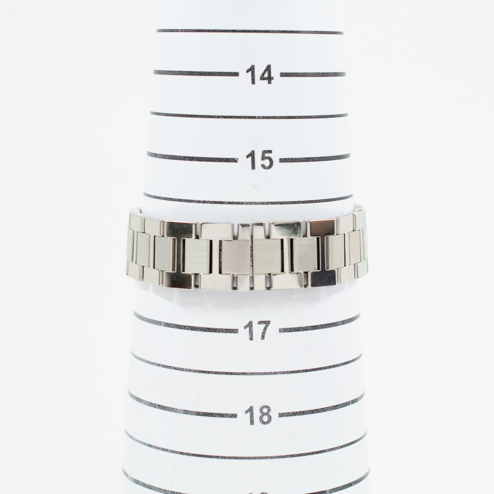 Stainless steel case with a stainless steel bracelet. Fixed stainless steel bezel. Silver dial with blue steel hands and Roman numeral hour markers. Minute markers. 24 hour (GMT) scale around an inner ring. Quartz movement. Scratch resistant mineral crystal. Blue sapphire cabochon crown. Solid case back. Case diameter: 29 mm. Case thickness: 6.35 mm. Hidden fold over deployment clasp. Water resistant at 30 meters / 100 feet. Functions: hours, minutes, GMT.