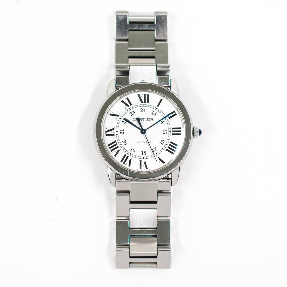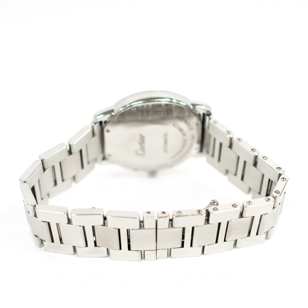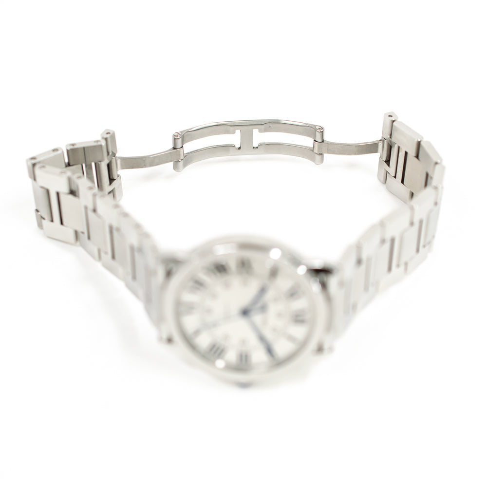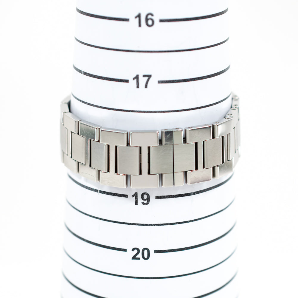 Stainless steel case with a stainless steel bracelet. Fixed stainless steel bezel. Silver opaline dial with blued-steel sword-shaped hands and black Roman numeral hour markers. 24 hour markers. Minute markers around an inner ring. Dial Type: Analog. Automatic movement with a 42-hour power reserve. Scratch resistant sapphire crystal. Pull / push crown. Solid case back. Round case shape. Case size: 36 mm. Case thickness: 9.46 mm. Deployment clasp. Water resistant at 30 meters / 100 feet. Functions: hour, minute, second, 24 hour.