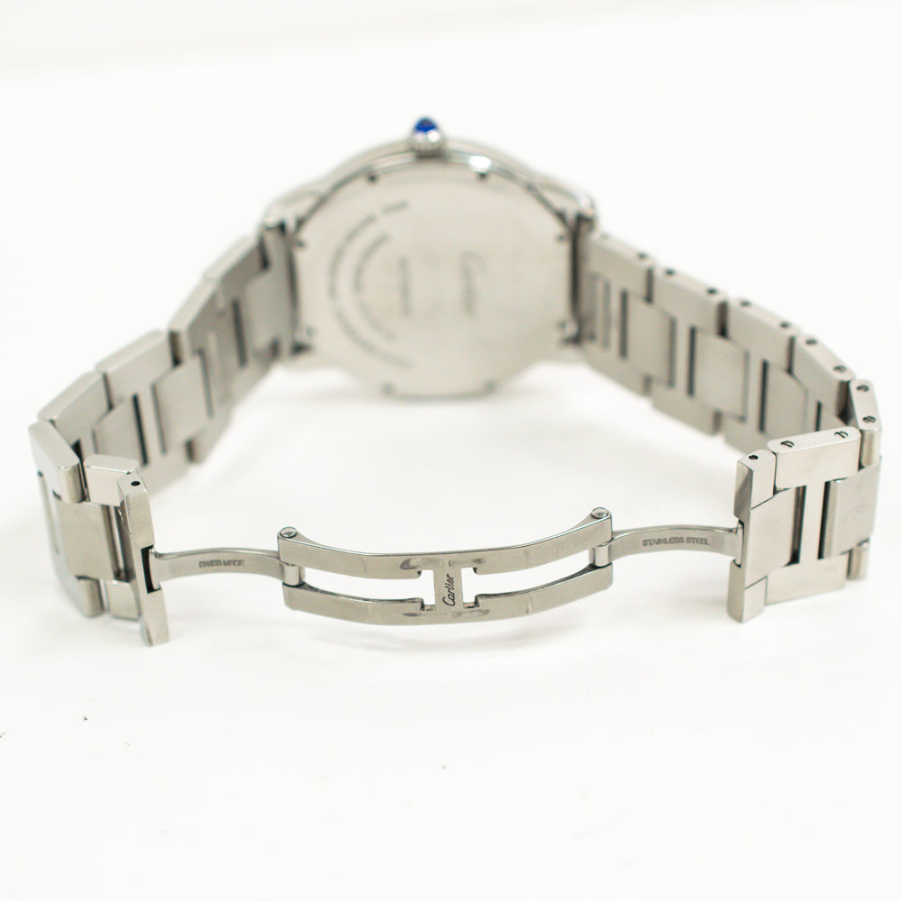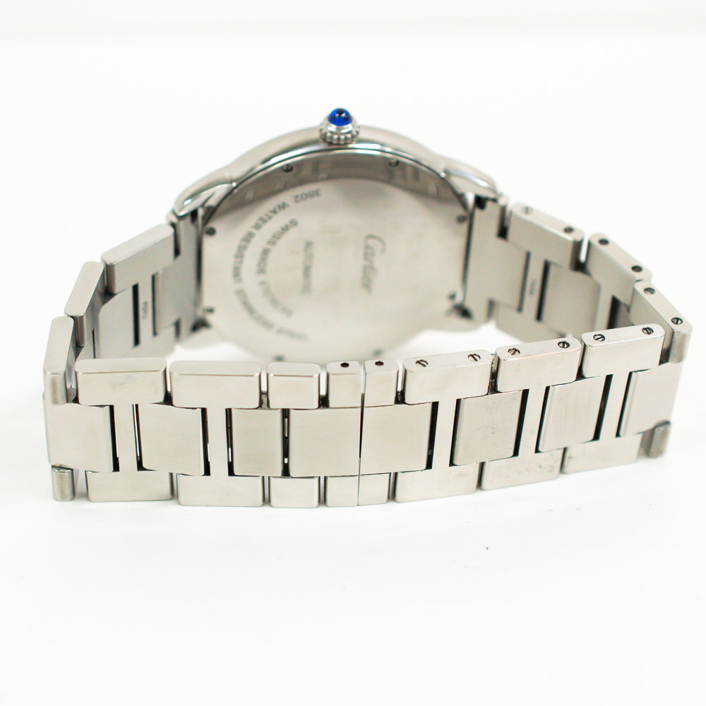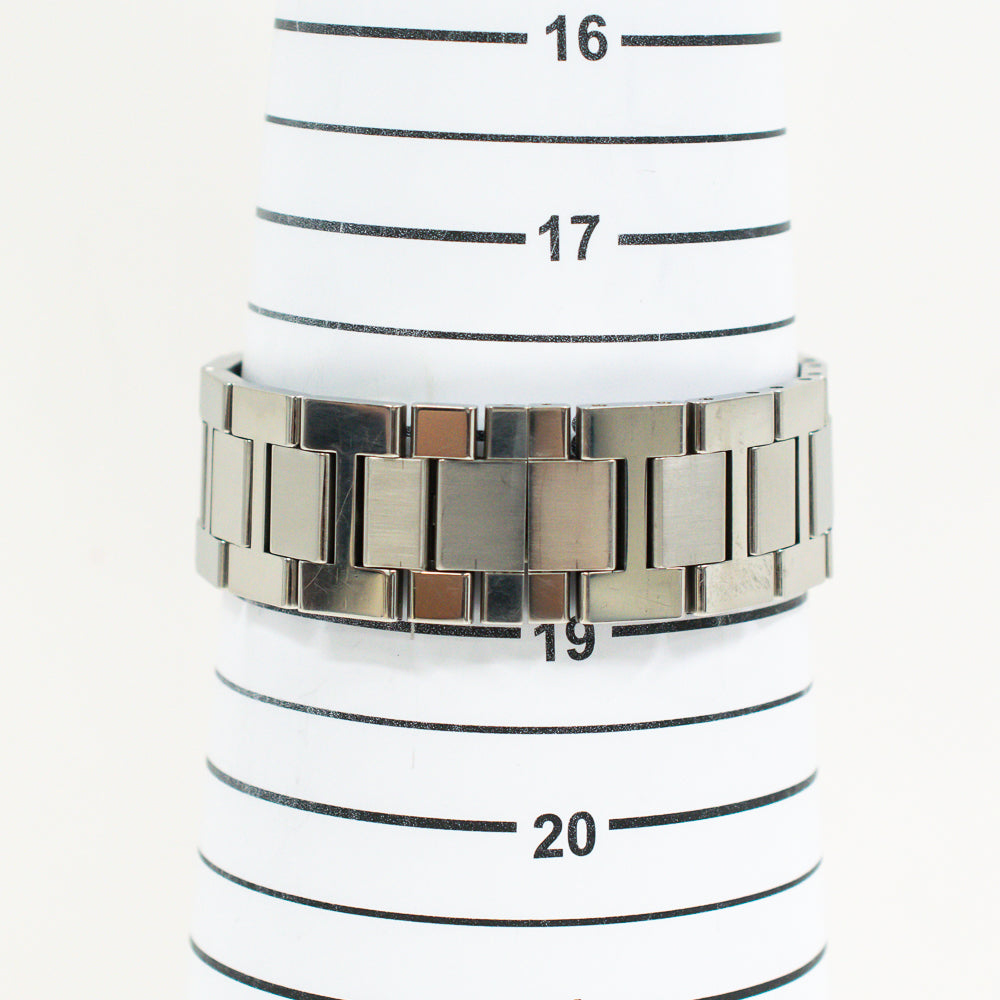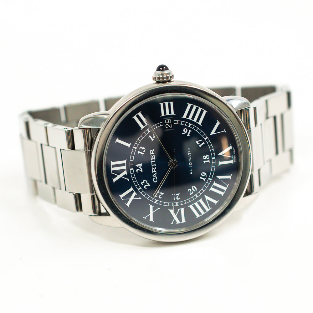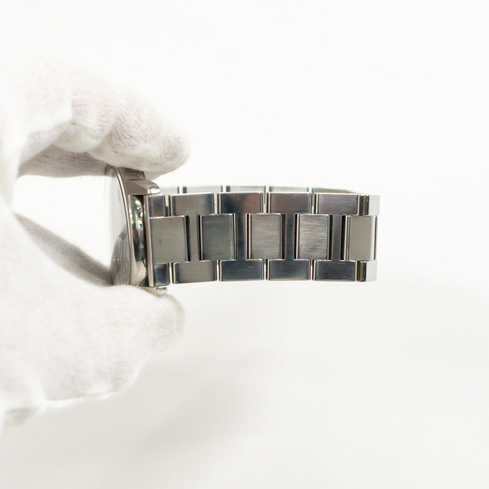 Stainless steel case with a stainless steel bracelet. Fixed stainless steel bezel. Blue dial with silver-tone hands and Roman numeral hour markers. 24 hour markers. Minute markers around an inner ring. Dial Type: Analog. Date display at the 3 o'clock position. Automatic movement. Scratch resistant sapphire crystal. Pull / push crown set with a blue spinel cabochon. Solid case back. Round case shape. Case size: 42 mm. Case thickness: 8.36 mm. Hiden fold over clasp. Water resistant at 30 meters / 100 feet. Functions: date, hour, minute, second.