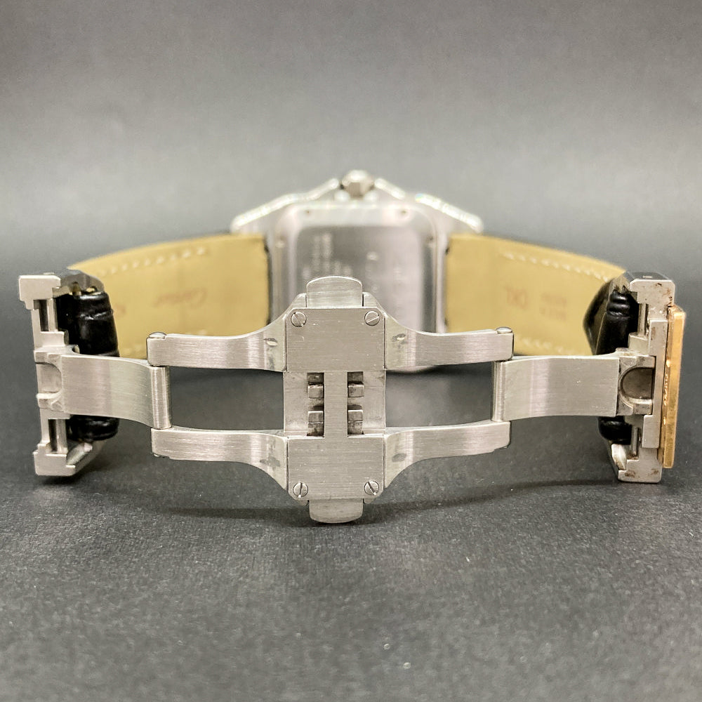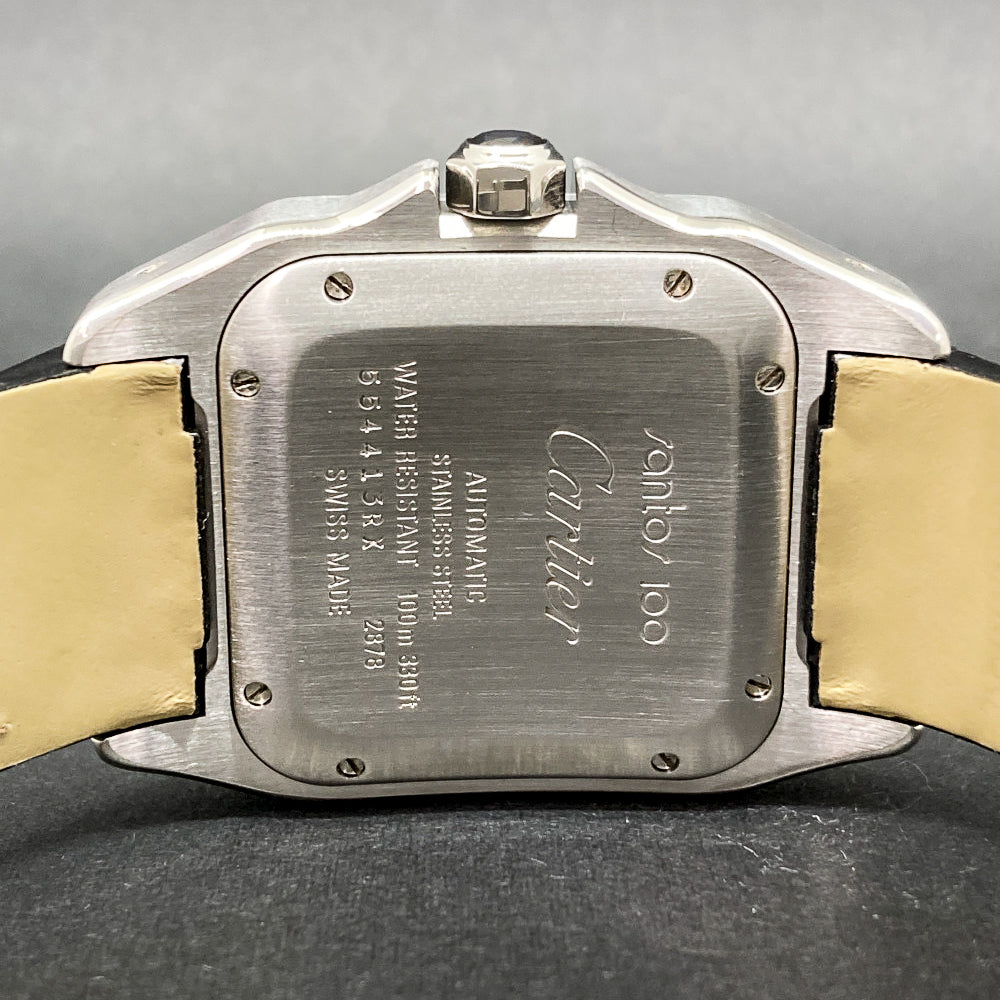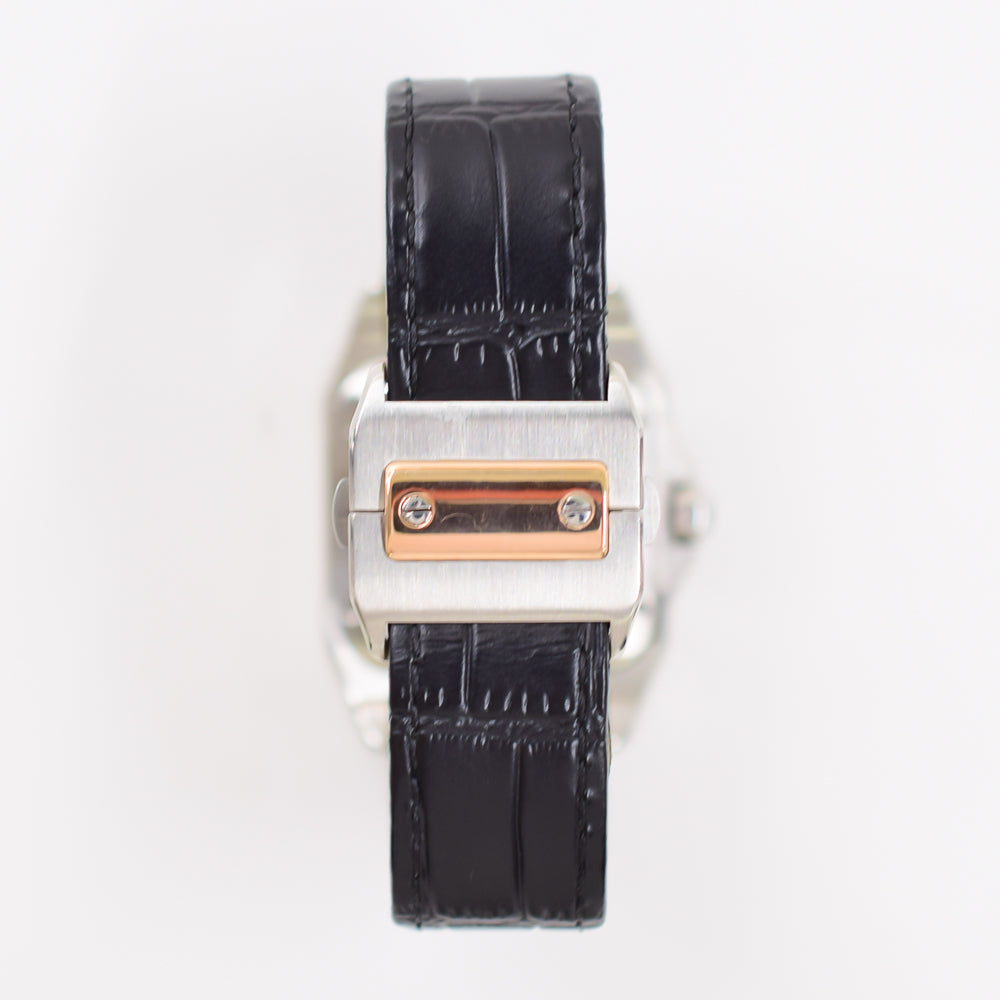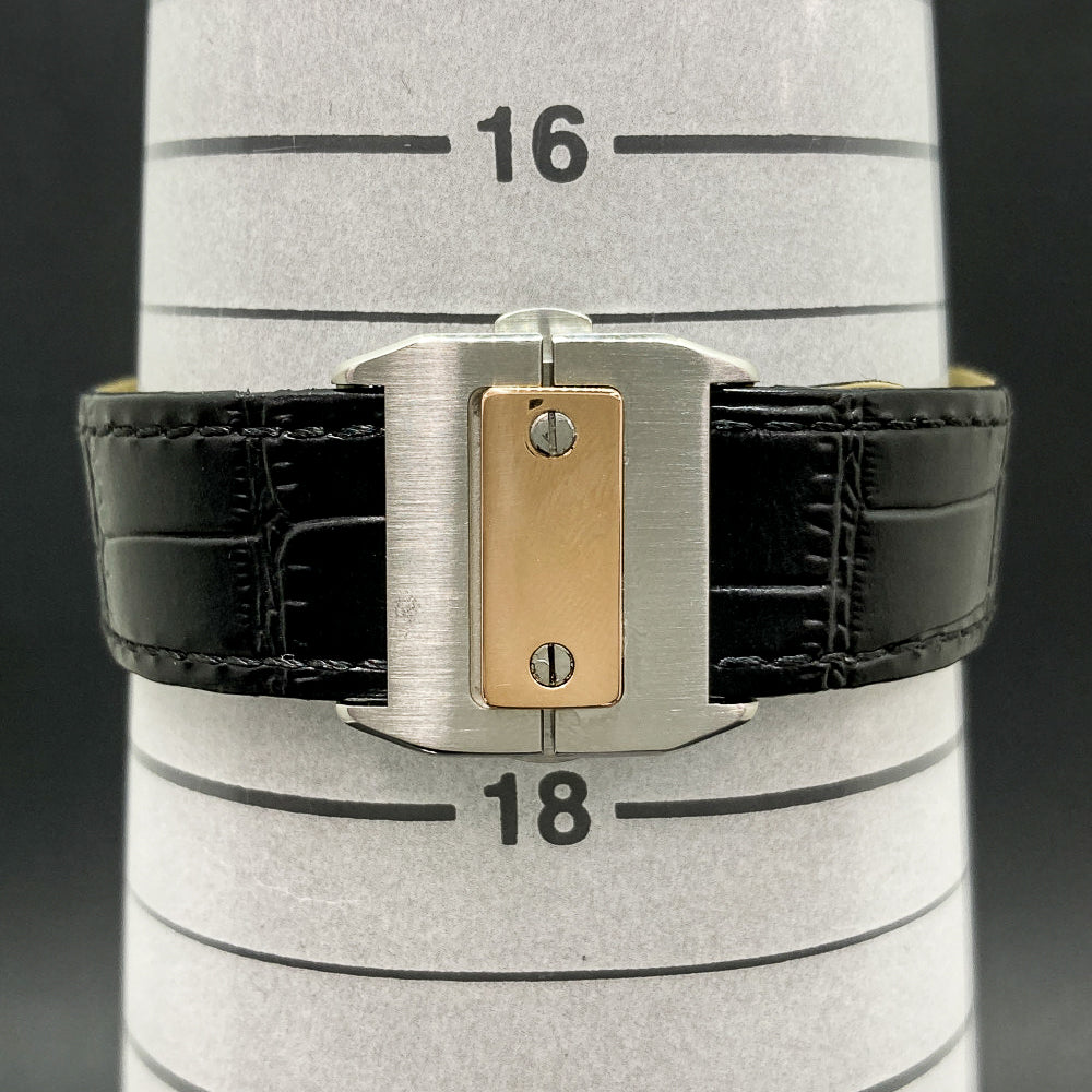 Stainless steel case with a black leather strap. Fixed 18kt rose gold bezel. White dial with luminescent sword-shaped hands and Roman numeral hour markers. Minute markers around an inner ring. Dial Type: Analog. Cartier calibre 049 automatic movement, based upon ETA 2892-A2, containing 21 Jewels, bitting at 28800 vph, and has a power reserve of approximately 42 hours. Scratch resistant sapphire crystal. 18kt rose gold octagonal crown set with a faceted spinal. Solid case back. Square case shape. Case size: 33 mm. Case thickness: 11 mm. Fold under deployment clasp. Water resistant at 100 meters / 330 feet. Functions: hour, minute, second.
