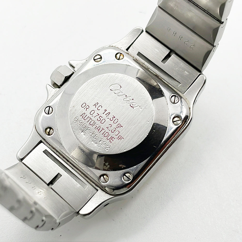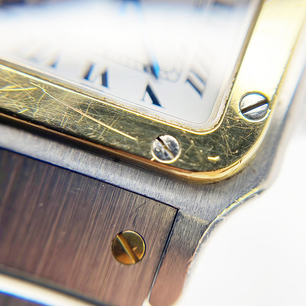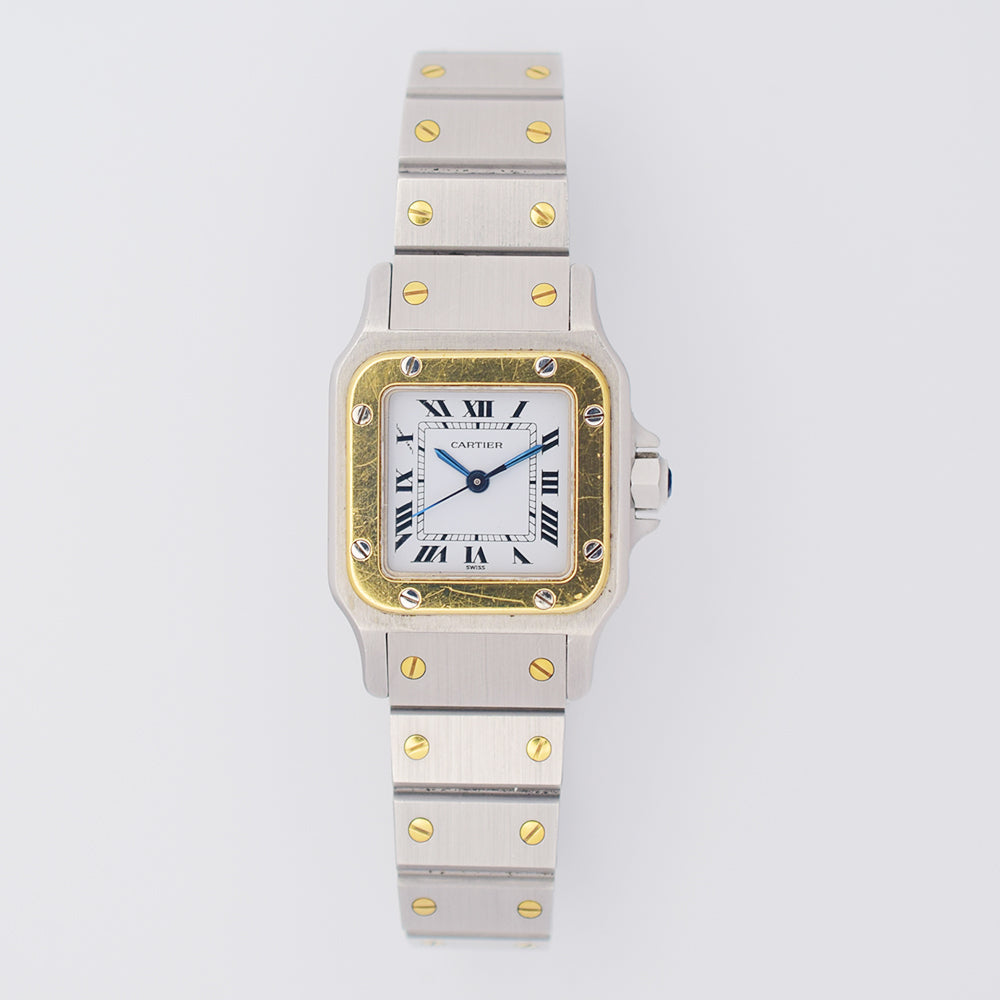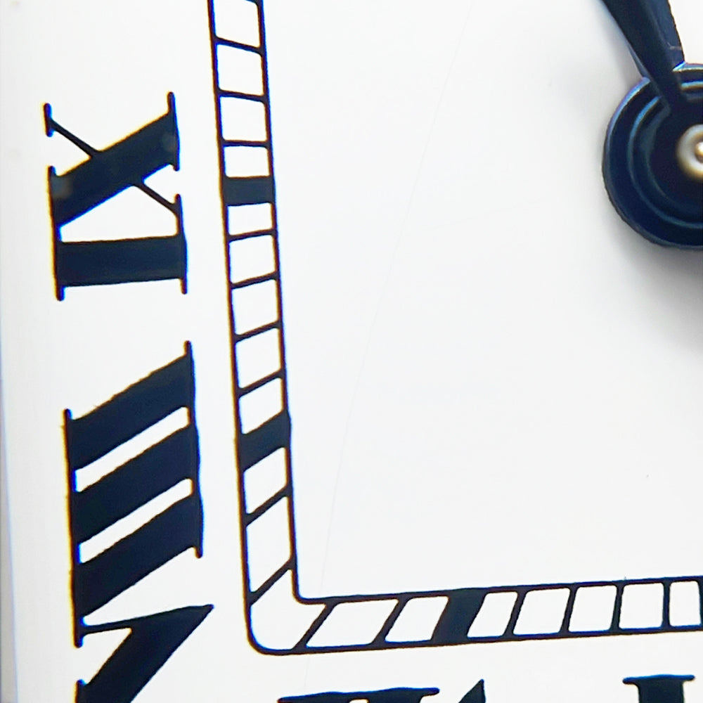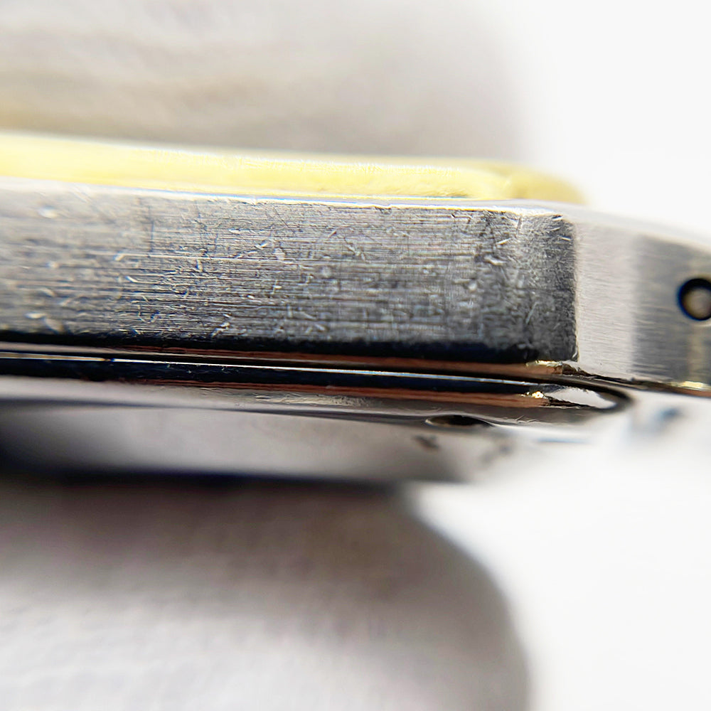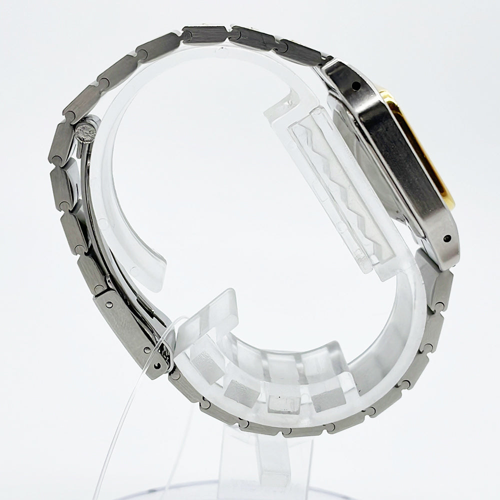 Stainless steel case with a stainless steel bracelet with 18kt yellow gold screws. Fixed 18kt yellow gold bezel. Silver opaline dial with blue hands and black Roman numeral hour markers. Minute markers around the inner ring. Dial Type: Analog. Luminescent hands and dial markers. Quartz movement. Scratch resistant sapphire crystal. Pull / push octaganol stainless steel crown. Stainless steel case back. Case diameter: 24 mm. Case thickness: 6 mm. Square case shape. Band width: 17.7 mm. Band length: 7 inches. Hidden deployment clasp. Water resistant at 30 meters / 100 feet. Functions: hours, minutes.