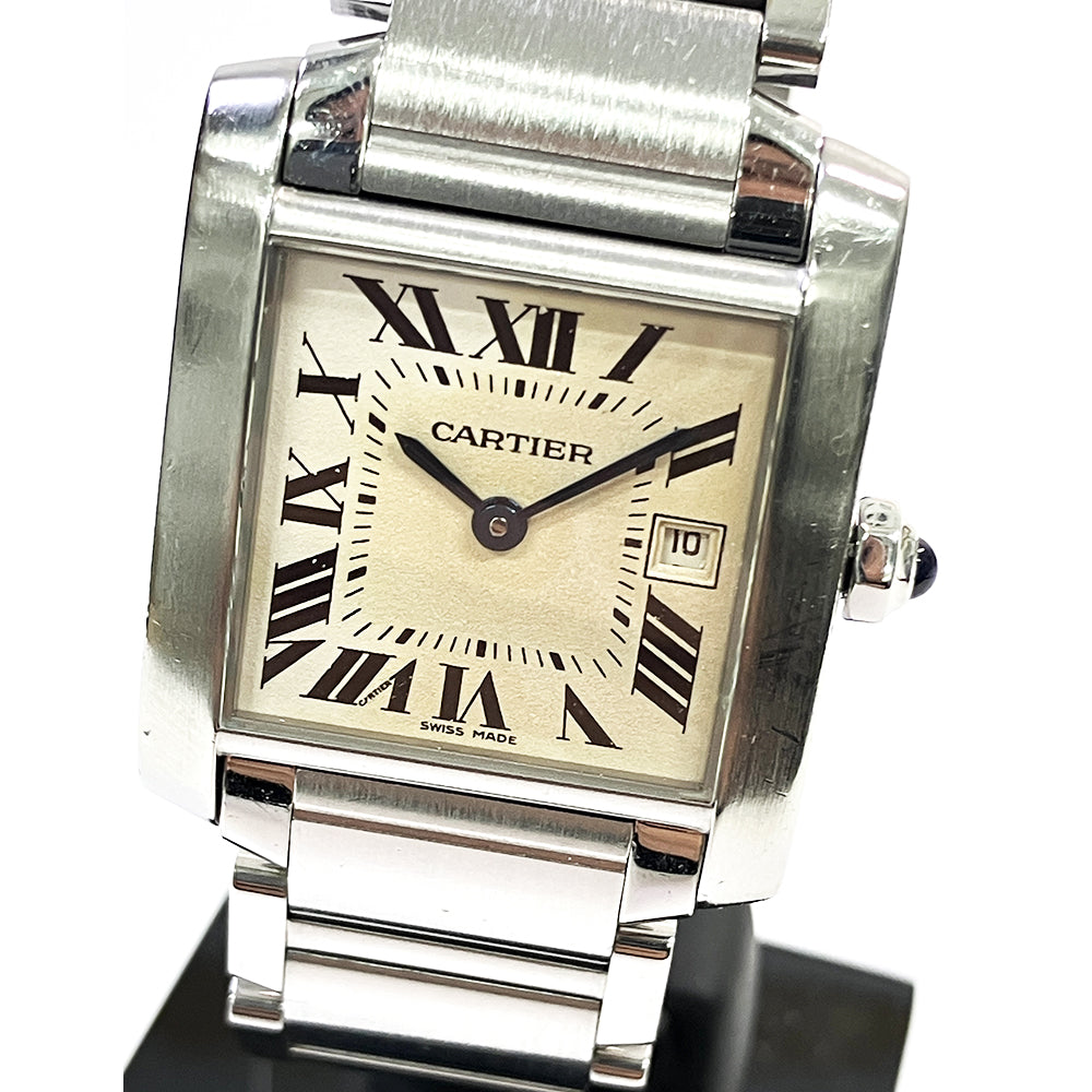 Case: Original cartier rectangular stainless steel 25mm x 29.5mm case. octagonal crown set with a blue sapphire cabochon.