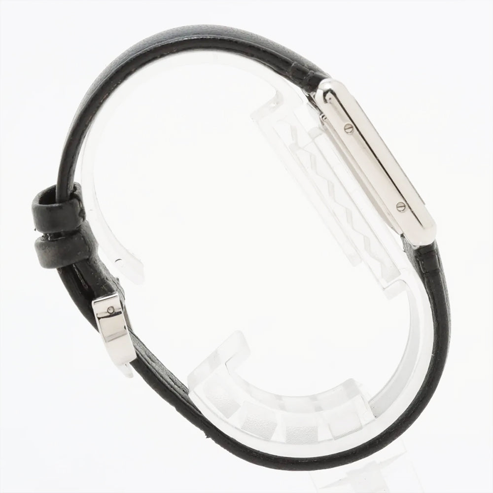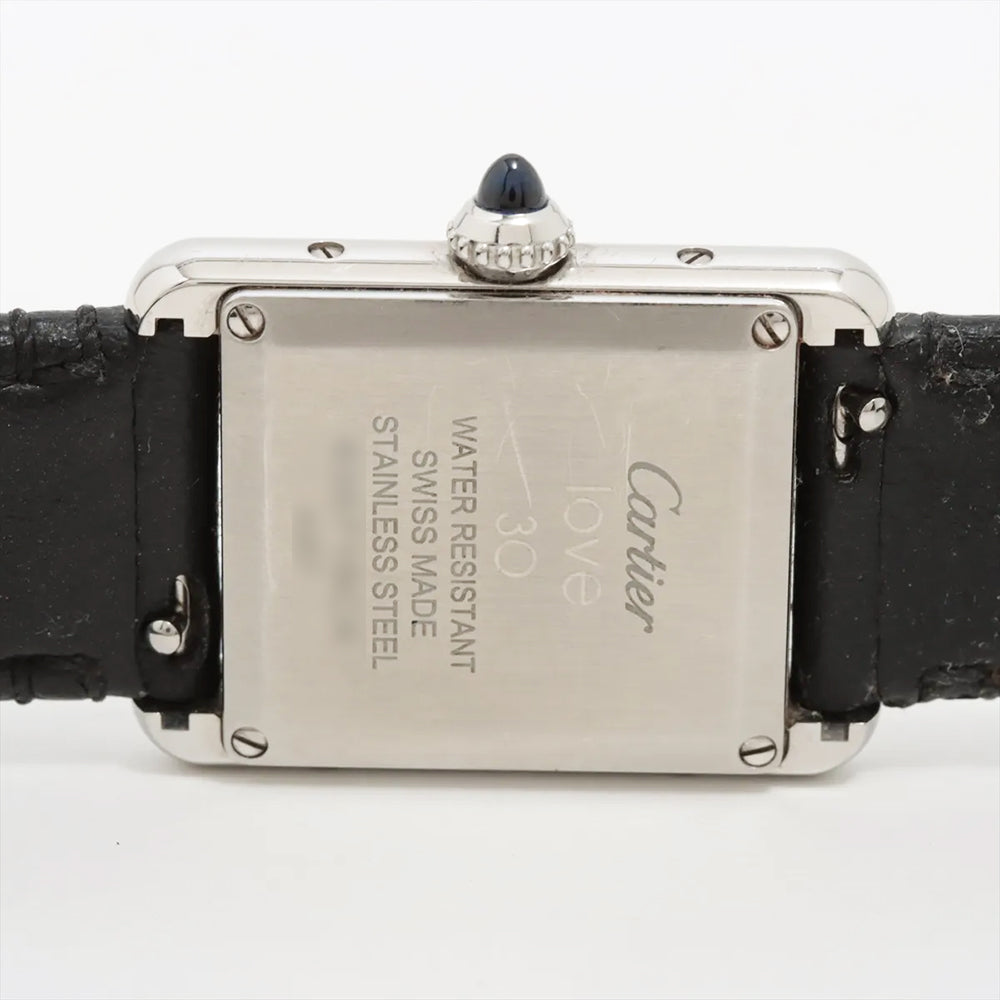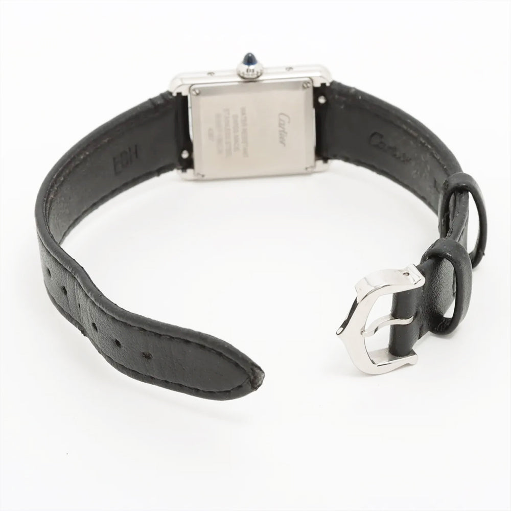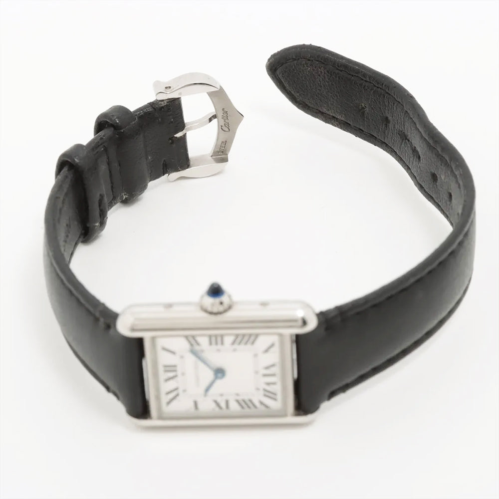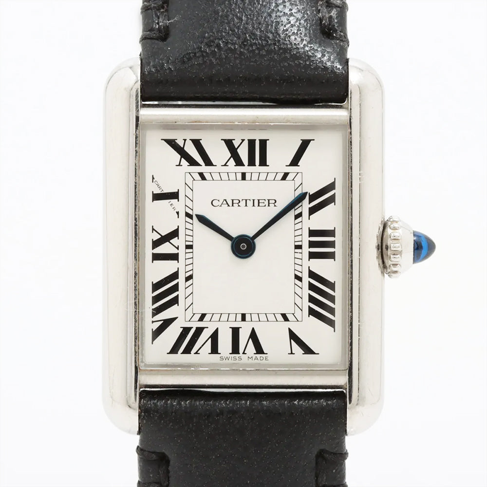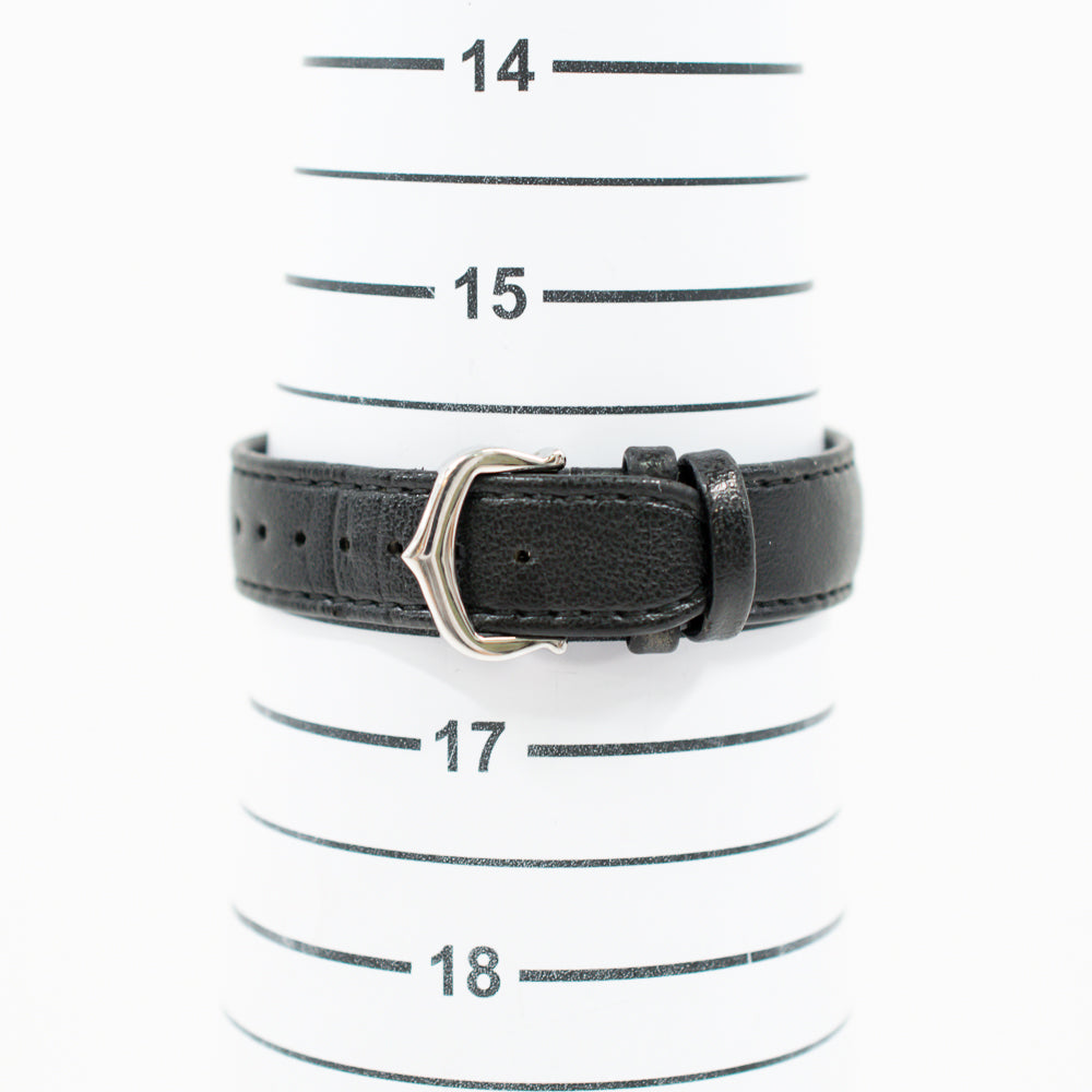 Stainless steel case with a black (vegan) leather strap. Fixed stainless steel bezel. White dial with blued-steel sword-shaped hands and Roman numeral hour markers. Minute markers around an inner ring. Dial Type: Analog. Quartz movement. Scratch resistant sapphire crystal. Cabochon crown. Solid case back. Rectangle case shape. Case dimensions: 29mm x 22mm. Case thickness: 6.6 mm. Tang clasp. Water resistant at 30 meters / 100 feet. Functions: hour, minute.