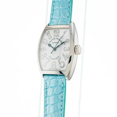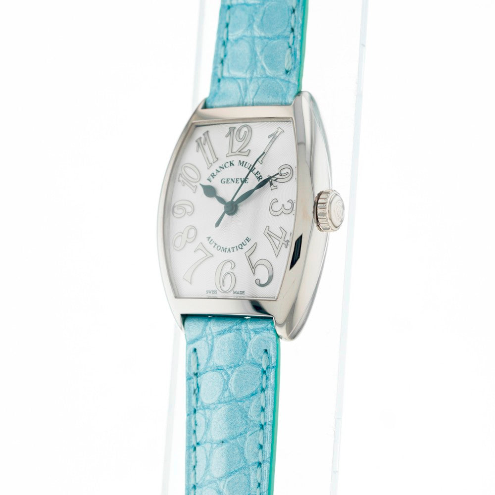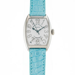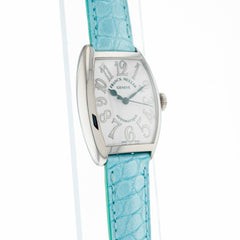 18kt white gold case with a blue genuine leather strap. Fixed 18kt white gold bezel. White dial with black hands and Arabic numeral hour markers. Dial Type: Analog. Automatic movement. Scratch resistant sapphire crystal. Tonneau case shape, case size: 28 mm. Functions: hour, minute, second. Cintree Curvex Series. Dress watch style. Watch label: Swiss Made.