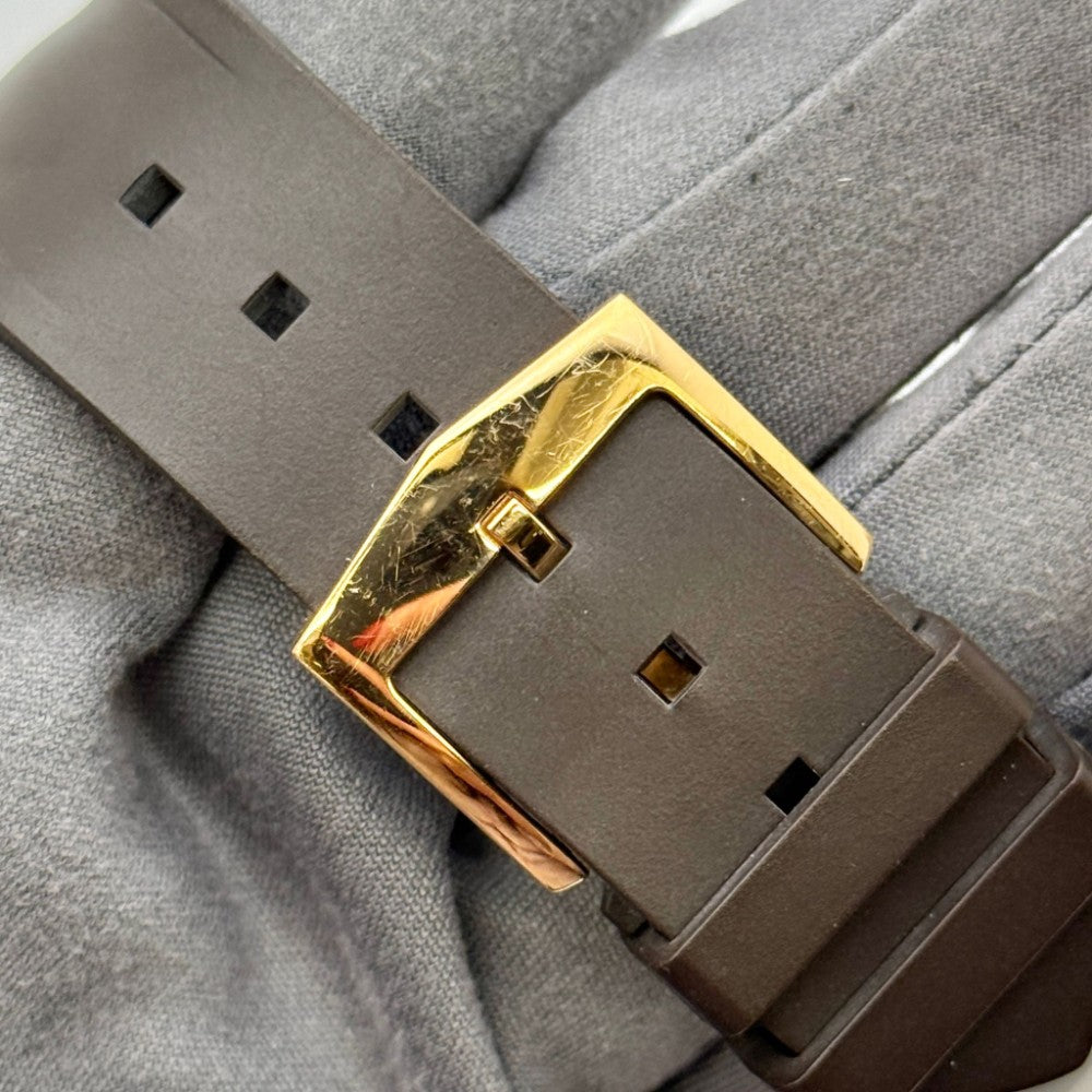 Within its 44mm 18K rose gold and Zalium case, the Harry Winston Ocean Diver is a testament to modern luxury and rugged precision. The 18K rose gold bezel adds an opulent touch, while the grey and black dial, complemented by luminescent hands, ensures readability in various lighting conditions. At the 6 o'clock position, a discreet date window enhances the watch's practicality. The watch features an automatic movement, providing essential functions such as hours, minutes, and a date display.