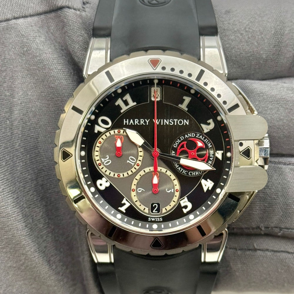 Watch Harry Winston Project Z2 Ocean Diver in 18K White Gold And Zalium. Black Rubber Strap With Tang Clasp. Fixed 18K White Gold Bezel. Black Dial With Arabic Numeral Hour Markers. Sub Seconds At 3 O'clock Position. Date And 12 Hour Counter A 6 O'clock Position. 30 Minute Counter at 9 O'clock Position. Swiss Automatic Movement with 42-hour power reserve.