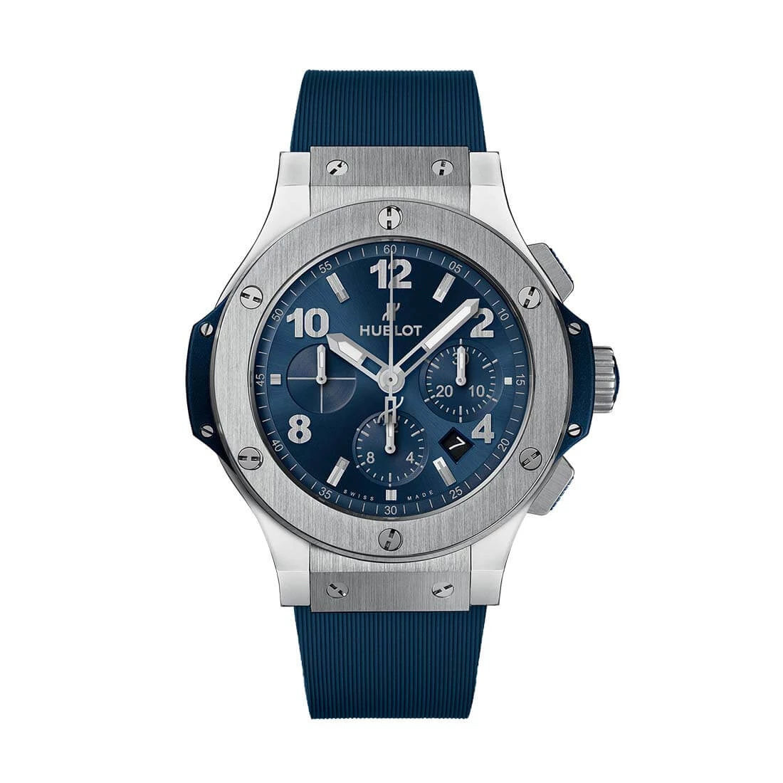 44 mm polished and satin-finished stainless steel case, vertical satin-finished stainless steel bezel with 6 h-shaped titanium screws, sapphire crystal with anti-reflective treatment, blue sunray satin-finished dial, HUB4100 self-winding chronograph movement, approximately 42 hours of power reserve, blue structured rubber strap, stainless steel deployant buckle. Water resistant to 100m (10 ATM).