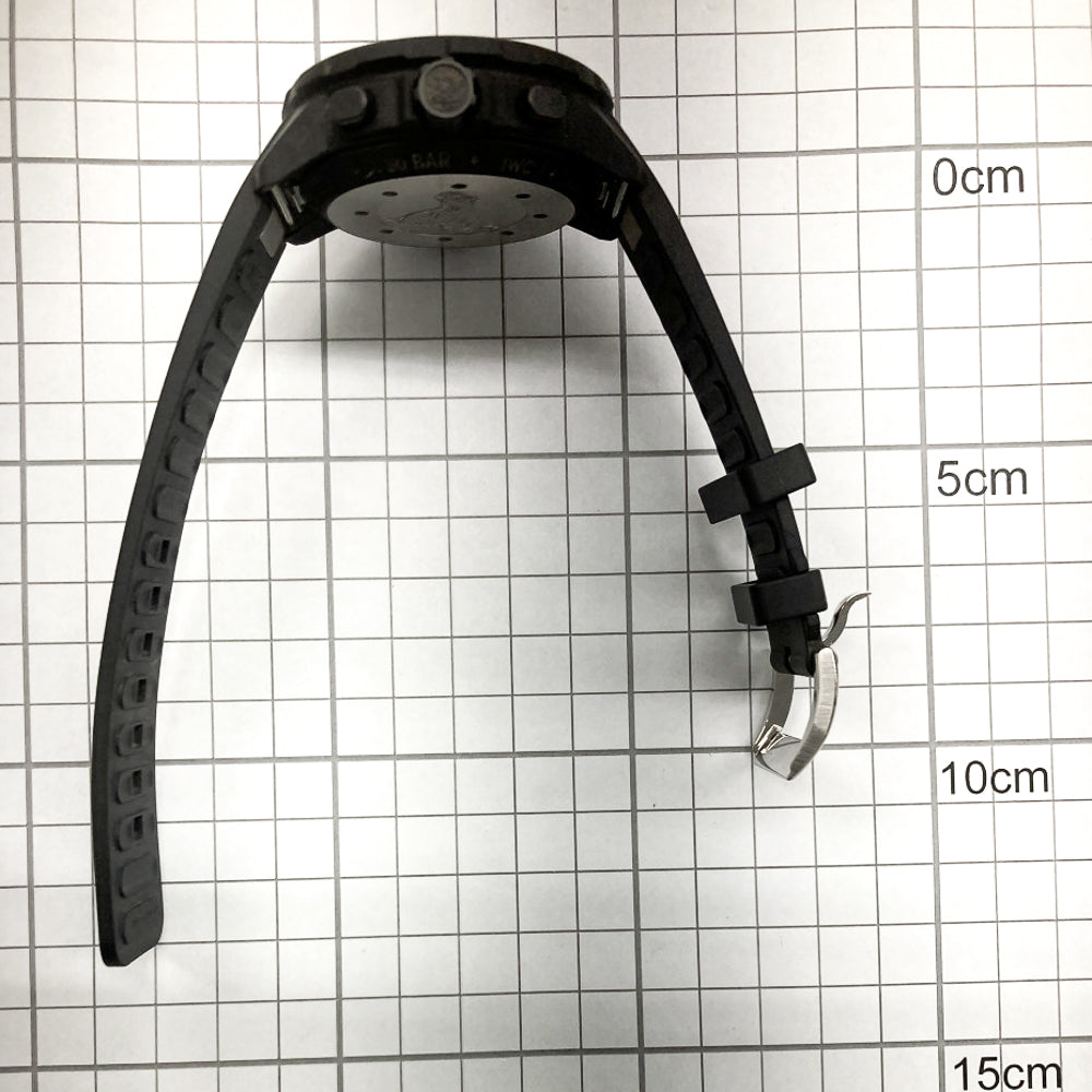 Black stainless steel with vulcanized rubber-coating case with a black rubber strap. Mechanical external/internal rotating black rubber coated inner bezel. Black dial with luminous hands and index hour markers. Minute markers around the outer rim. Dial Type: Analog. Luminescent hands and markers. Date display at the 3 o'clock position. Chronograph - two sub-dials displaying: 60 second and 60 minute. IWC calibre 89365 automatic movement, based upon IWC 89361, containing 38 Jewels, bitting at 28800 vph, and has a power reserve of approximately 68 hours. Scratch resistant sapphire crystal. Screw down crown. Solid case back. Round case shape. Case size: 45 mm. Case thickness: 17 mm. Tang clasp. Water resistant at 300 meters / 1000 feet. Functions: chronograph, flyback, date, hour, minute, small second. Aquatimer Chronograph Series. Dive watch style. Watch label: Swiss Made.