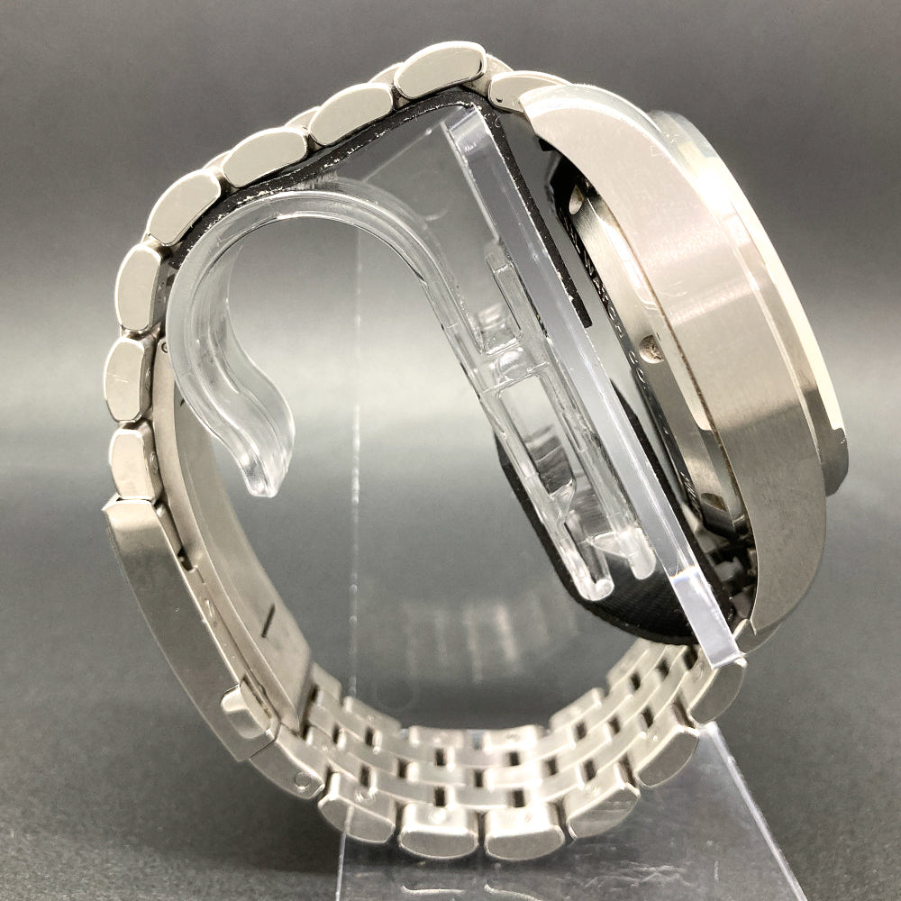 Silver-tone stainless steel case and bracelet. Fixed silver-tone stainless steel bezel. Black dial with silver-tone hands and Arabic numeral hour markers. Minute markers around the outer rim. Dial Type: Analog. Luminescent hands and markers. Day of the week and date display at the 3 o'clock position. Chronograph - three sub-dials displaying: 60 second, 30 minute and 12 hour. IWC Calibre 69385 Automatic movement, containing 33 Jewels, composed of 231 parts, bitting at 28800 vph, and has a power reserve of approximately 46 hours. Scratch resistant sapphire crystal. Screw down crown. Transparent see through case back. Round case shape, case size: 41 mm. Fold over clasp with a safety release. Water resistant at 100 meters / 330 feet. Functions: chronograph, column wheel, date, day, hour, minute, small second.Pilots Series. Luxury watch style. Watch label: Swiss Made.