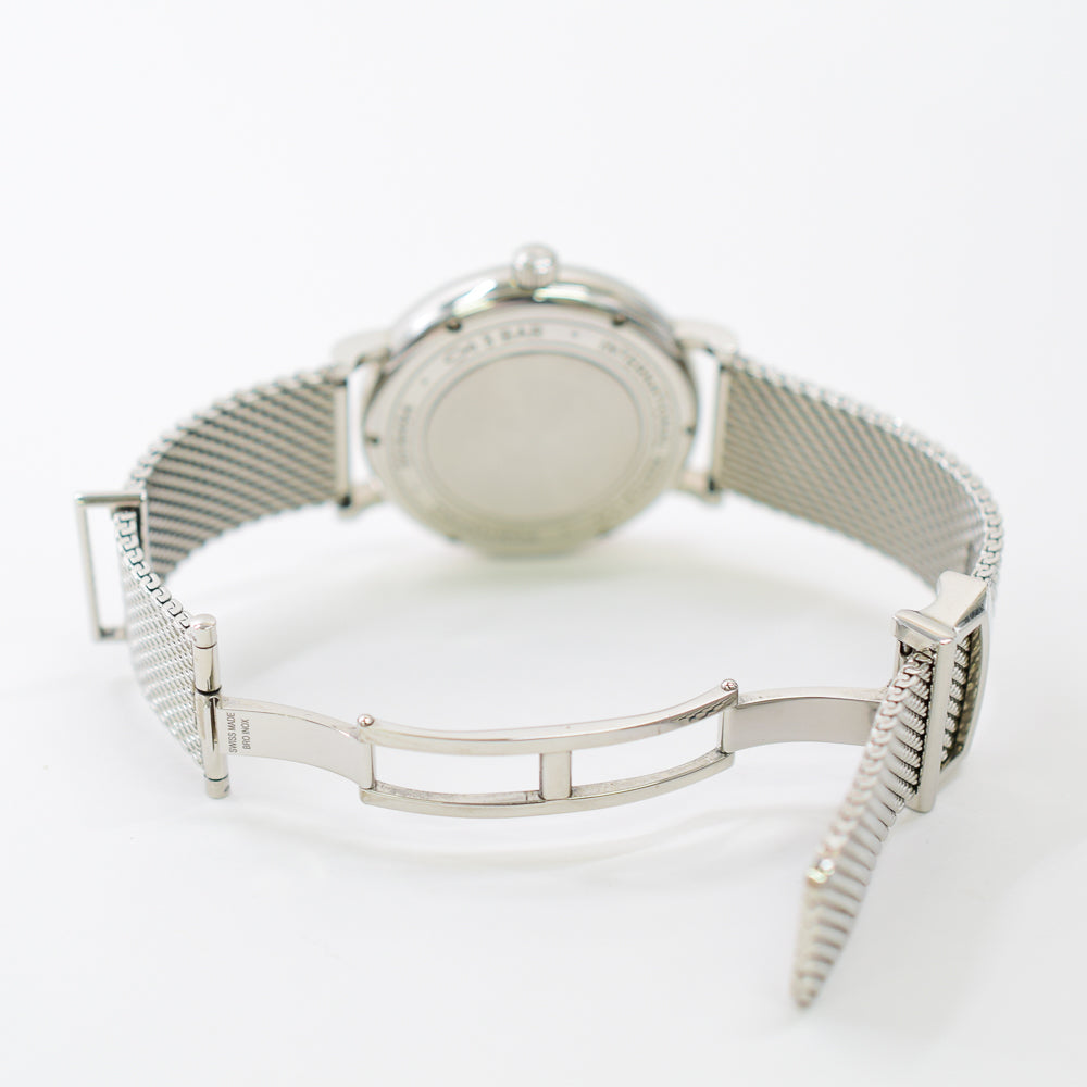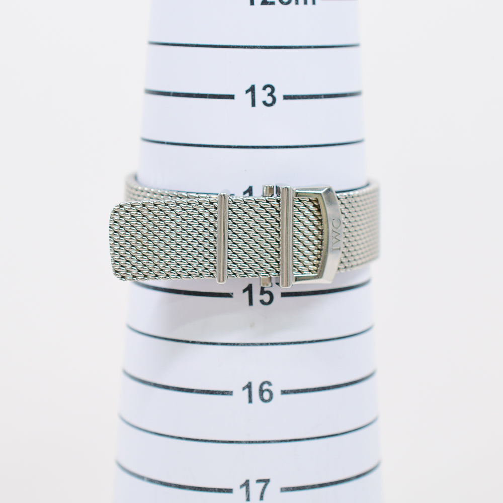 Silver-tone stainless steel case with a silver-tone stainless steel mesh bracelet. Fixed silver-tone stainless steel bezel. Anthracite dial with silver-toned leaf-style shape hands and index and diamond hour markers. Roman numerals mark the 6 and 12 o'clock positions. minute markers around the outer rim. Dial Type: Analog. Date display at the 3 o'clock position. IWC Calibre 35111 Automatic movement, based upon Sellita SW300-1, containing 25 Jewels, composed of 163 parts, bitting at 28800 vph, and has a power reserve of approximately 42 hours. Scratch resistant sapphire crystal. Solid case back. Round case shape, case size: 37 mm, case thickness: 9 mm. Band width: 18 mm. Fold over clasp. Water resistant at 30 meters / 100 feet. Functions: date, hour, minute, second. Portofino Series. Luxury watch style. Watch label: Swiss Made.