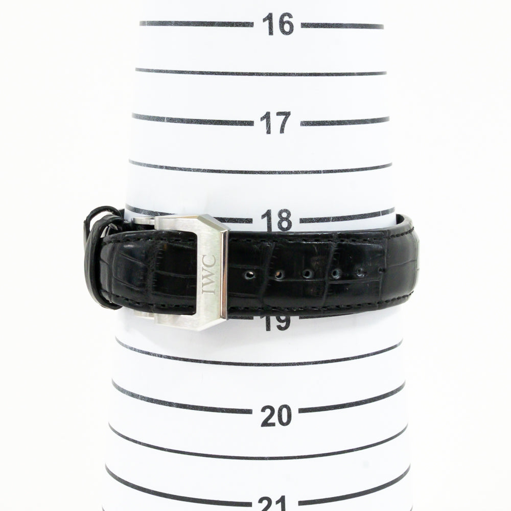 Stainless steel case with a black (crocodile) leather strap. Fixed stainless steel bezel. Silver dial with rose gold-tone leaf-style hands and Arabic numeral hour markers. Arabic numeral minute markers (at 5 minute intervals). Minute markers around the outer rim. Dial Type: Analog. Chronograph - two sub-dials displaying: 30 minute and 60 second. IWC calibre 79350 automatic movement, based upon ETA 7750, containing 31 Jewels, bitting at 28800 vph, and has a power reserve of approximately 44 hours. Scratch resistant sapphire crystal. Pull / push crown. Solid case back. Round case shape. Case size: 40.9 mm. Case thickness: 12.3 mm. Band width: 20 mm. Deployment clasp. Water resistant at 30 meters / 100 feet. Functions: chronograph, hour, minute, second. Portuguese Series. Sport watch style. Watch label: Swiss Made.