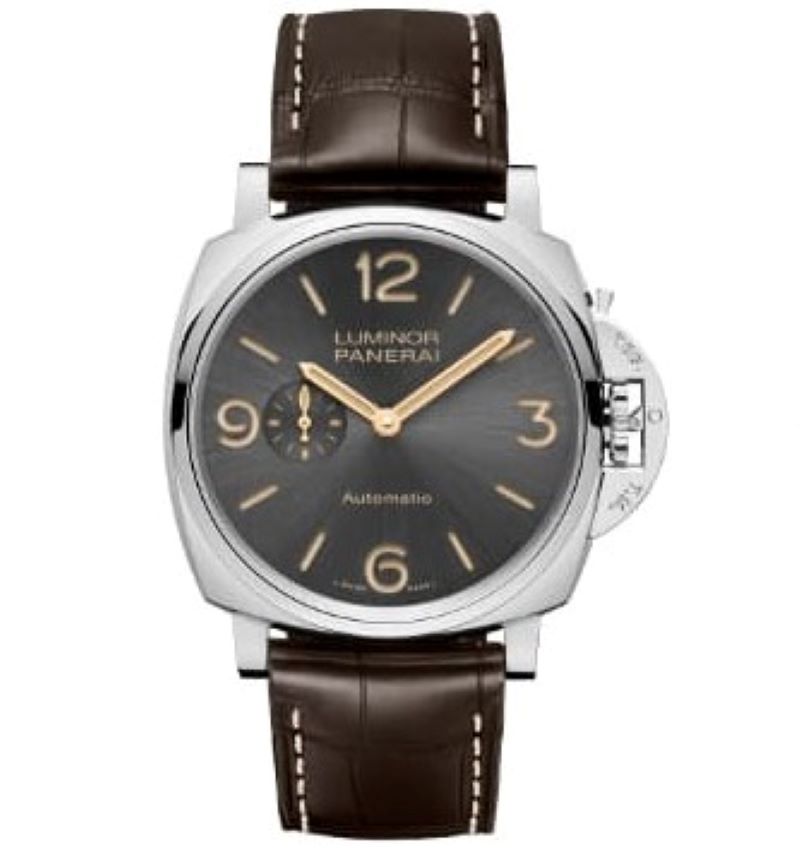 Silver-tone stainless steel case with a brown leather strap. Fixed silver-tone stainless steel bezel. Anthracite sun-brushed dial with gold-tone hands and Arabic numeral and index hour markers. Dial Type: Analog. One - small second subdial. Panerai Calibre P.4000/10 automatic movement with a 72-hour power reserve. Scratch resistant sapphire crystal. Transparent case back. Cushion case shape. Case size: 45 mm. Band width: 24/22 mm. Buckle clasp. Water resistant at 30 meters / 100 feet.