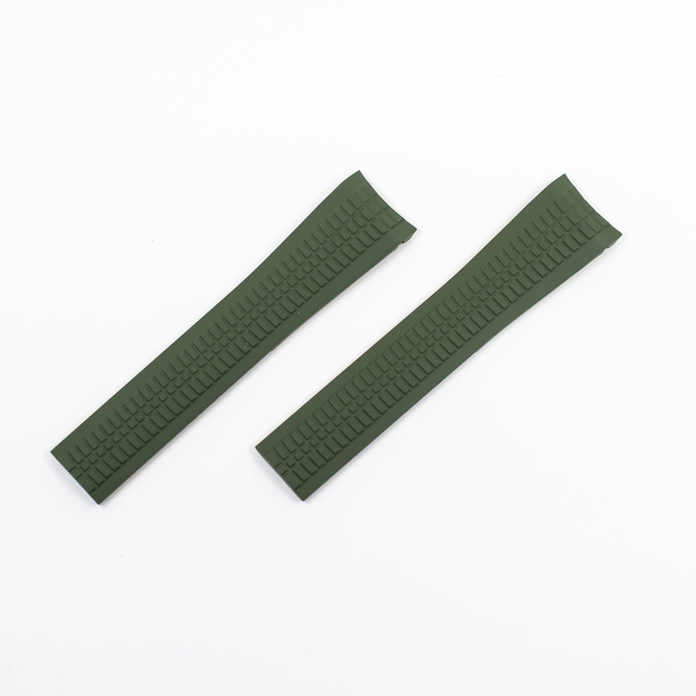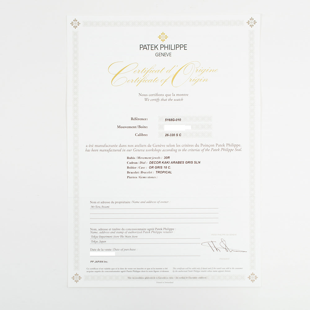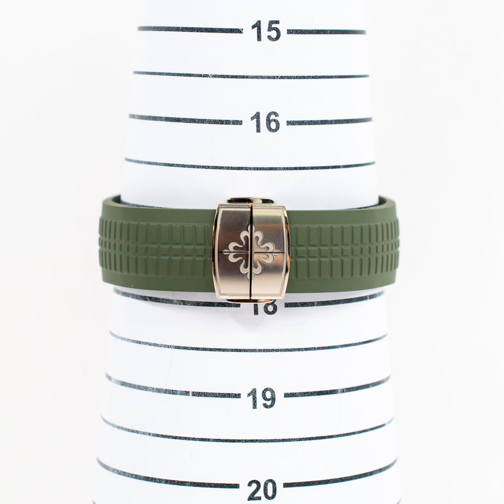 18kt white gold case with a green rubber strap. Fixed 18kt white gold bezel. Green dial with luminous silver-tone hands and index/ Arabic numeral hour markers. Minute markers around the outer rim. Dial Type: Analog. Luminescent hands and markers. Date display at the 3 o'clock position. Patek Philippe calibre 324 S C automatic movement, containing 29 Jewels, composed of 213 parts, bitting at 28800 vph, and has a power reserve of approximately 45 hours. Scratch resistant sapphire crystal. Screw down crown. Transparent case back. Cushion case shape. Case size: 42.2 mm. Fold over clasp with a safety release. Water resistant at 120 meters / 400 feet. Functions: date, hour, minute, second. Aquanaut Series. Sport watch style.