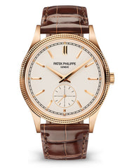 Patek Philippe Calatrava Small Seconds Silvery Grained Dial Leather Strap Men's Watch Model 6119R-001. Rose Gold case with Brown Leather Alligator strap. Fixed 18kt Rose Gold bezel. Dial description: Dauphine Style Hands and Rose Gold Index Hour Markers on a Silvery Grained dial. Automatic movement. Chronograph sub-dials display: Small Seconds. Powered by Patek Philippe Caliber 30?255 PS engine with 65 hours power reserve. Watch functions: Power Reserve, Hour, Minute, Second. Scratch Resistant Sapphire crystal. Round case shape. Case size: 39mm. Case thickness: 8mm. Transparent case back. 30 Meters - 100 Feet water resistant.