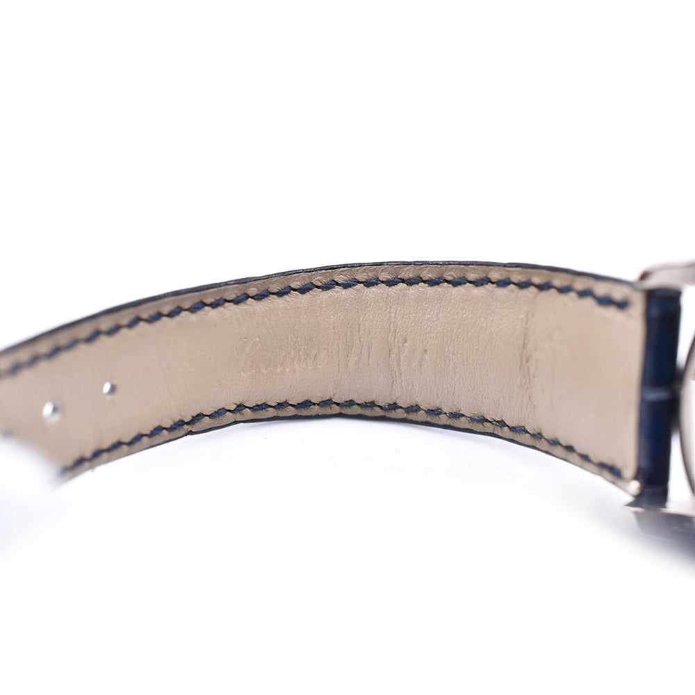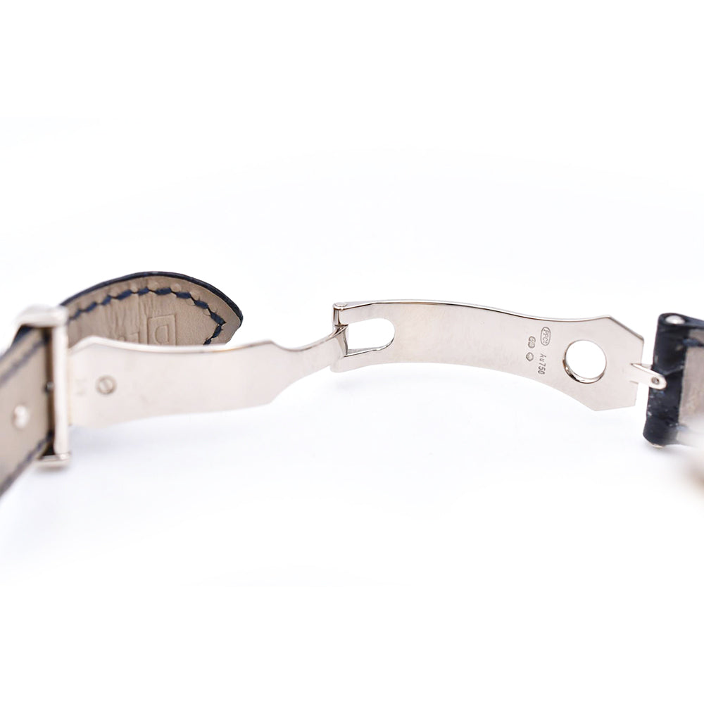 Patek Philippe Complications World Time Chronograph (5930G001) self - winding automatic watch, features a 39.5mm 18k white gold case surrounding a blue opaline hand-guilloched dial on a blue alligator strap with an 18k white gold Calatrava Cross deployant buckle. Functions include hours, minutes, small seconds, chronograph, gmt/world time and day/night indicator.
