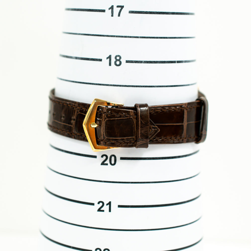 18kt rose gold case with a brown leather strap. Fixed 18kt rose gold bezel. White dial with rose gold-tone leaf-style hands and Arabic numeral hour markers. Minute markers around the outer rim. Dial Type: Analog. Date display at the 6 o'clock position. Three sub-dials displaying: date/moon phase, day/24 hour indicator and month/leap year cycle. Patek Philippe Calibre 240 Q Automatic movement, containing 27 Jewels, composed of 275 parts, bitting at 21600 vph, and has a power reserve of approximately 48 hours. Scratch resistant sapphire crystal. Pull / push crown. Transparent case back. Cushion case shape, case size: 37 x 44.6 mm. Buckle clasp. Water resistant at 30 meters / 100 feet. Functions: perpetual calendar, moon phase, leap year, month, date, day, GMT, second time zone, hour, minute, small second, day/night indicator. Grand Complications Series. Luxury watch style. Watch label: Swiss Made.