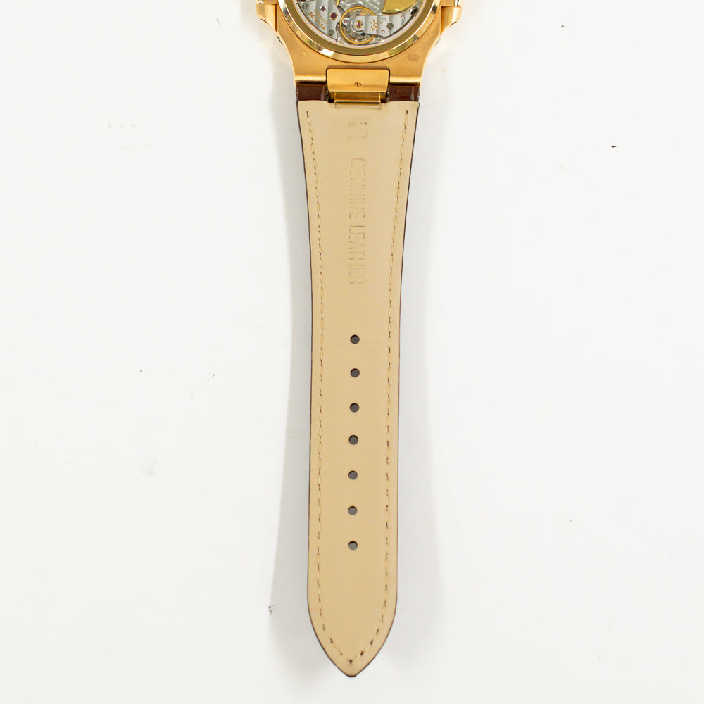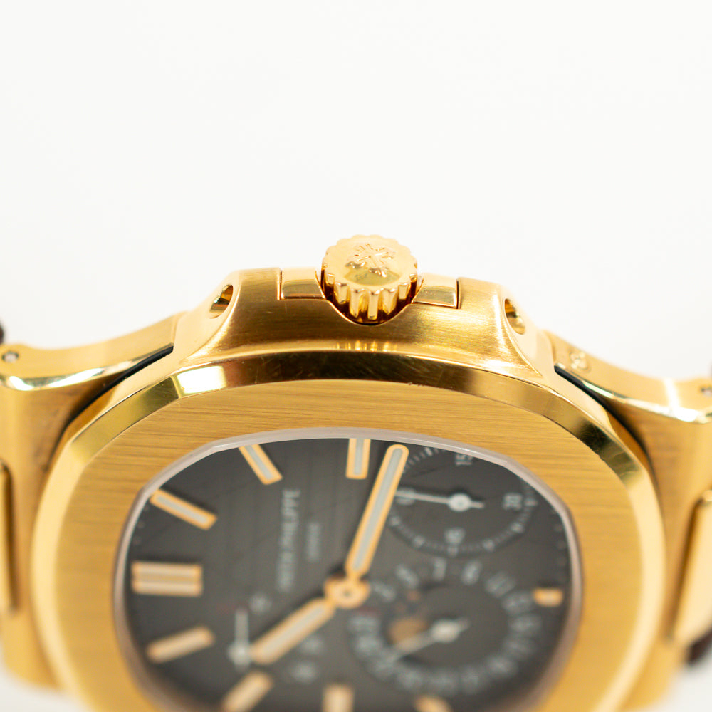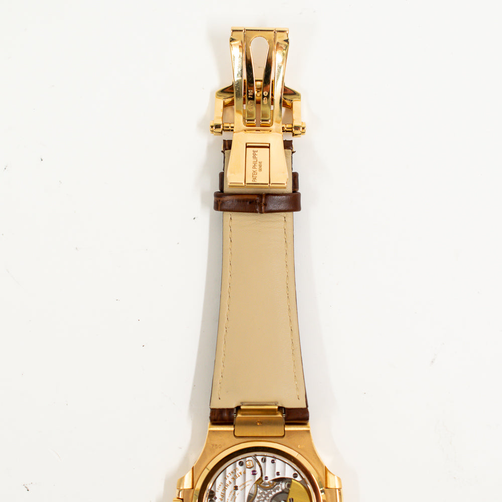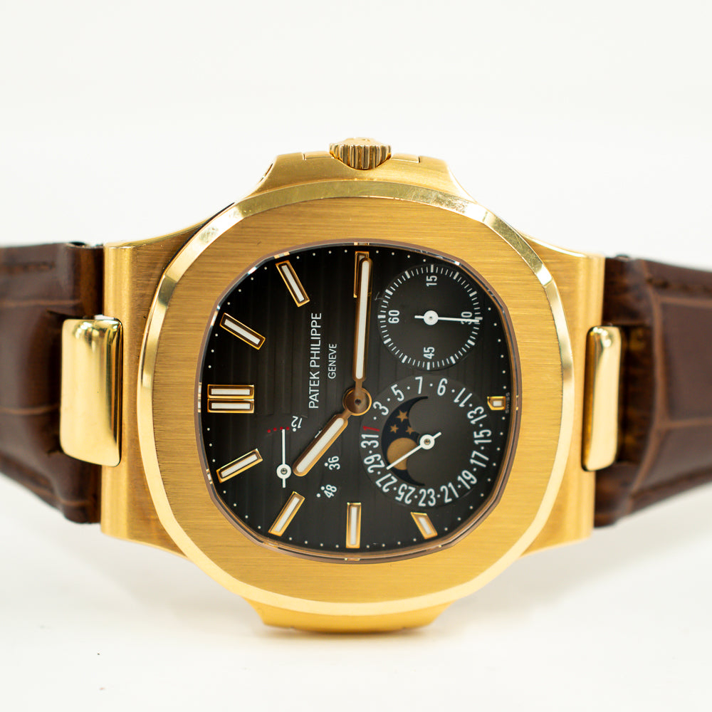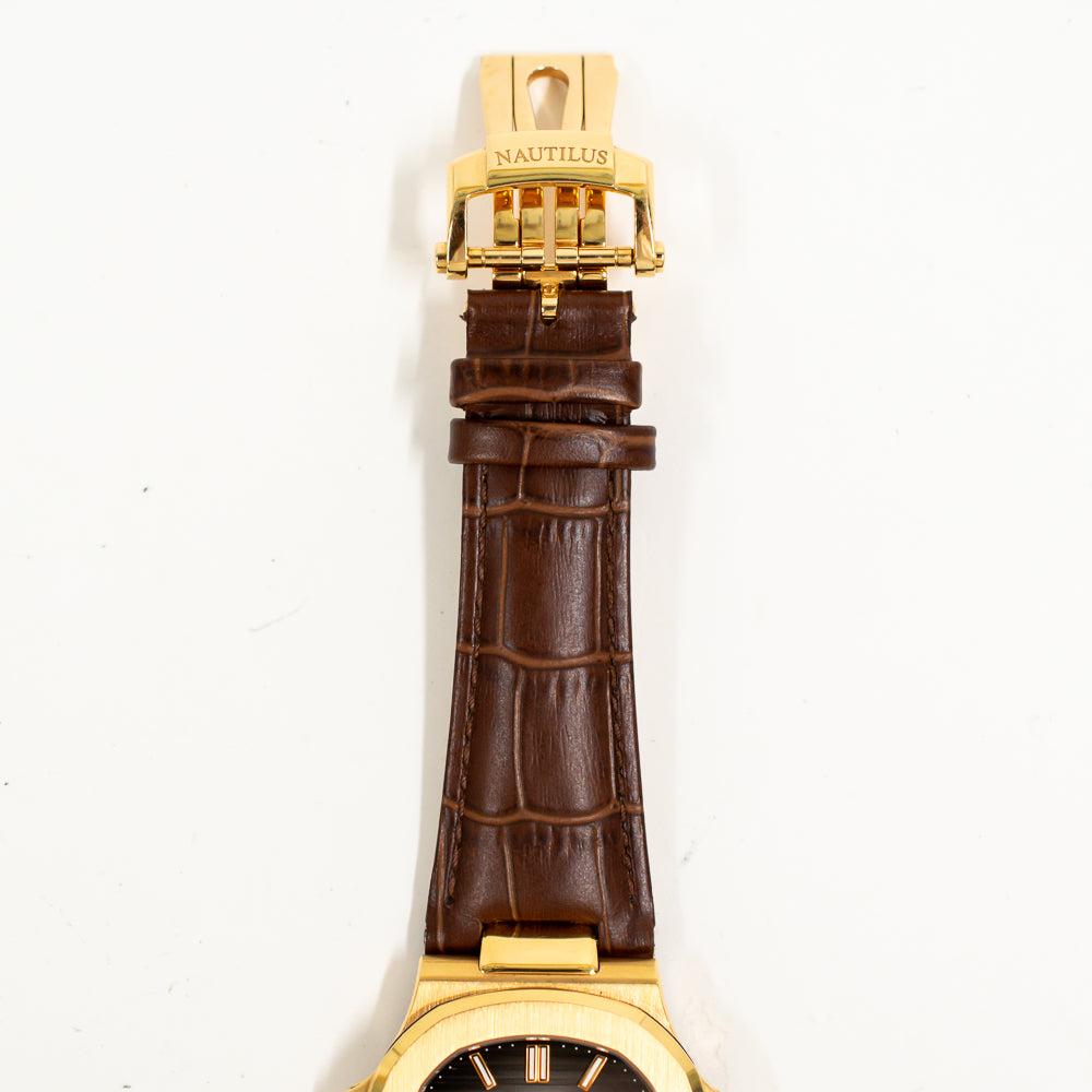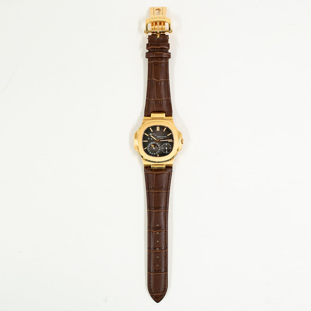 18kt rose gold case with a brown leather strap. Fixed 18kt rose gold bezel. Black dial with gold-tone hands and index hour markers. Minute markers around the outer rim. Dial Type: Analog. Date display at the 7 o'clock position. Three sub-dials displaying: small second, date/moonphase, power reserve indicator. Patek Philippe Calibre 240 PS IRM C LU Automatic movement, containing 29 Jewels, composed of 265 parts, bitting at 21600 vph, and has a power reserve of approximately 48 hours. Scratch resistant sapphire crystal. Fluted crown. Sapphire crystal case back. Cushion case shape, case size: 40 mm. Fold over clasp. Water resistant at 60 meters / 200 feet. Functions: moon phase, date, hour, minute, small second, power reserve indicator. Nautilus Series. Luxury watch style. Watch label: Swiss Made.