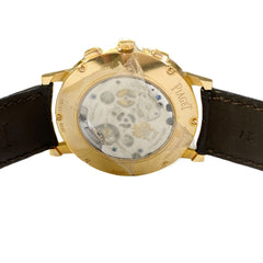 18kt rose gold case with a brown (alligator) leather strap. Fixed 18kt rose gold bezel. Silver dial with black hands and index hour markers. Minute markers around the outer rim. Dial Type: Analog. Chronograph - three sub-dials displaying: 60 second, 30 minute and 24 hour. Piaget calibre 883P hand wind movement, containing 30 Jewels, composed of 240 parts, bitting at 21600 vph, and has a power reserve of approximately 50 hours. Scratch resistant sapphire crystal. Pull / push crown. Transparent case back. Round case shape. Case size: 41 mm. Case thickness: 8.24 mm. Tang clasp. Water resistant at 30 meters / 100 feet. Functions: chronograph, column wheel, flyback, GMT, second time zone, hour, minute, small second.