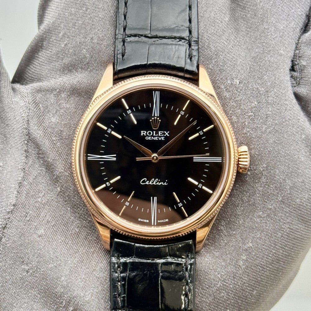 Dial: Black dial with rose gold baton hour markers and dauphine hands. Fine printed minute/seconds track.