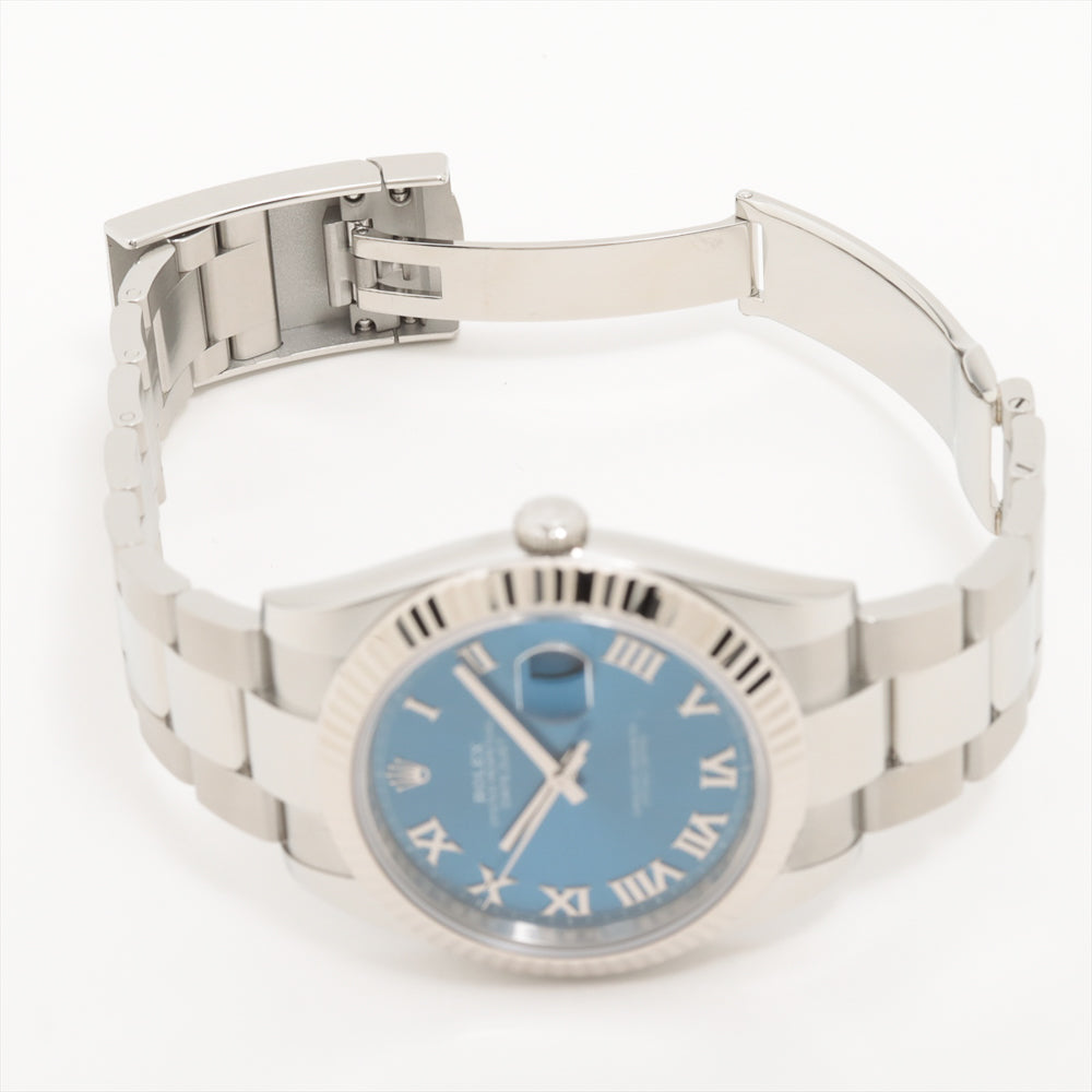 Dial: Blue dial with luminescent raised Roman numeral hour markers and baton hands. Outer minute marker track. Date calendar at the 3 o'clock aperture.