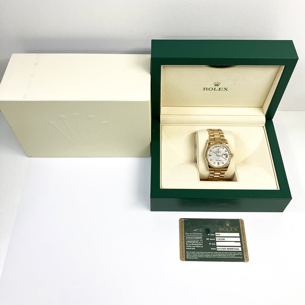 Dial: Mother of pearl dial with original Rolex factory diamond hour markers. Weekday aperture at 12 o'clock, date window at 3 o'clock.