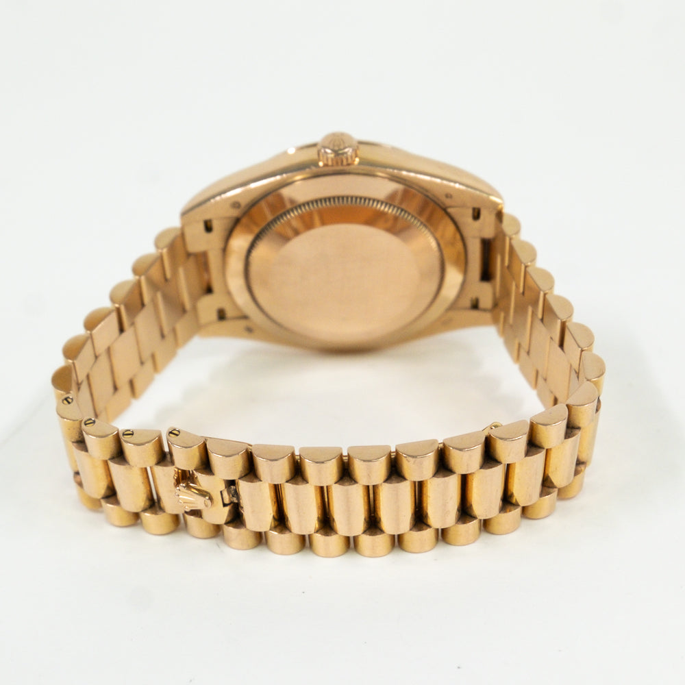 Dial: Chocolate dial with with original Rolex factory baguette diamond hour markers and rose gold baton hands. Date calendar at the 3 o'clock aperture. Weekday window at 12 o'clock.