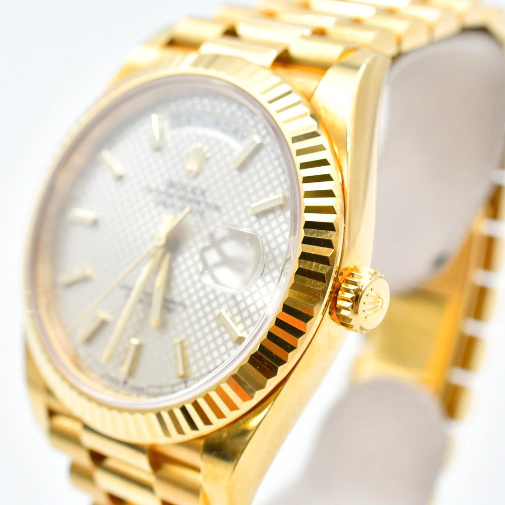 Dial: Silver diagonal motif dial with luminous yellow gold baton hour markers. Day window at 12 o'clock. Date window at 3 o'clock.