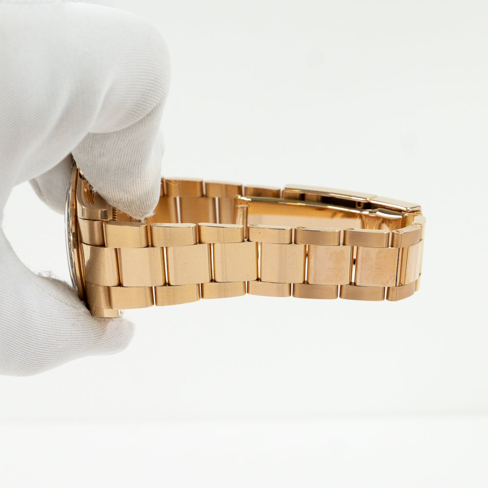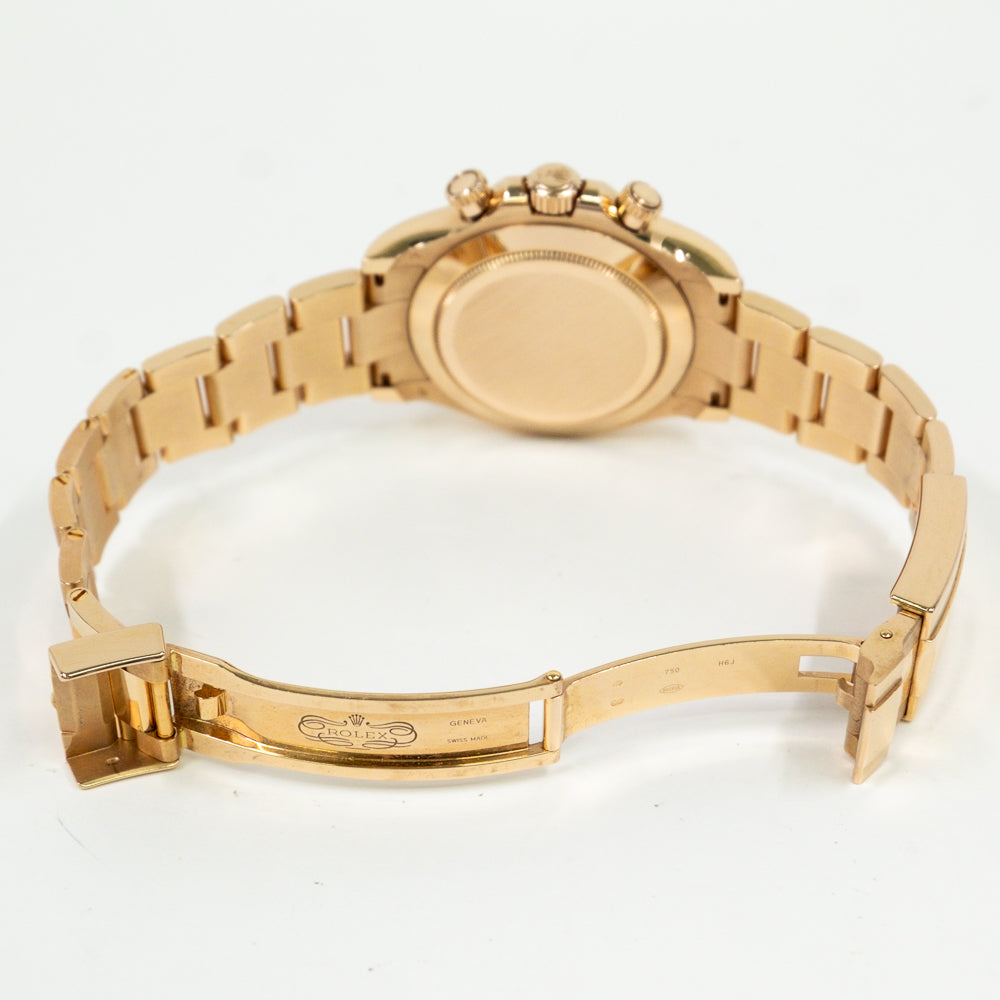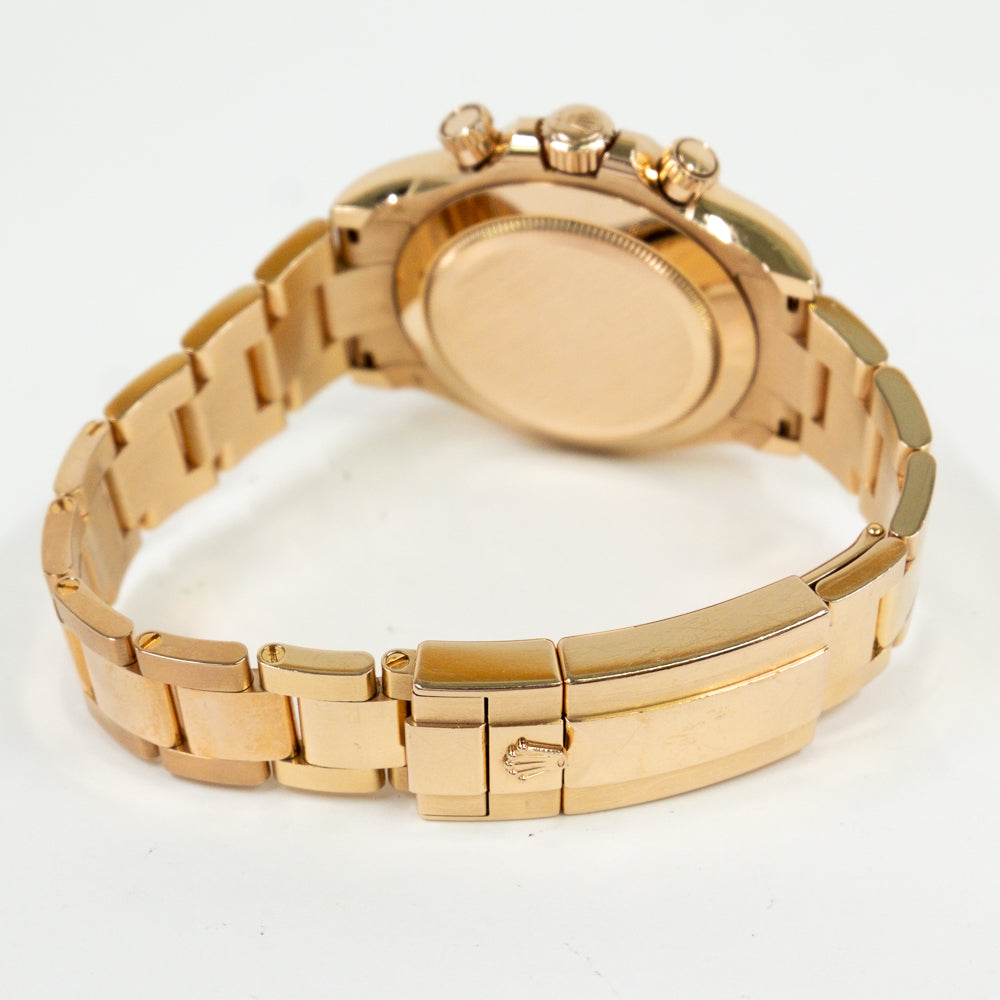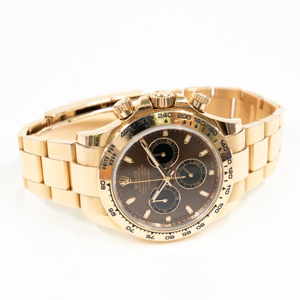 40mm 18K Everose gold case, screw-down crown and push buttons, fixed Everose gold bezel with engraved tachymetric scale, chocolate and black dial, index hour markers, Rolex calibre 4130 automatic movement, 18K Everosed gold Oyster bracelet, folding Oysterlock buckle with Easylink 5mm comfort extension link. Waterproof to 100 meters.
