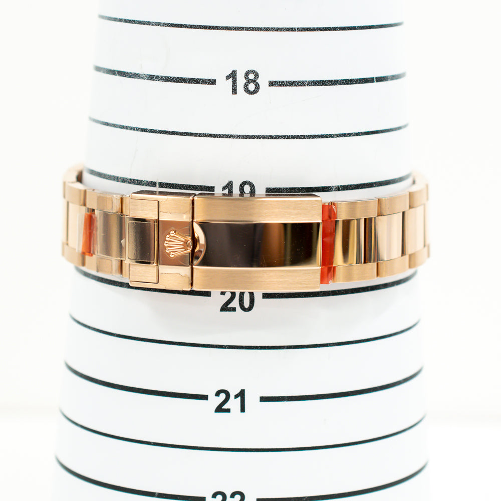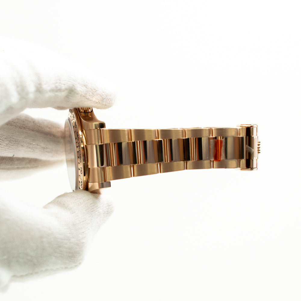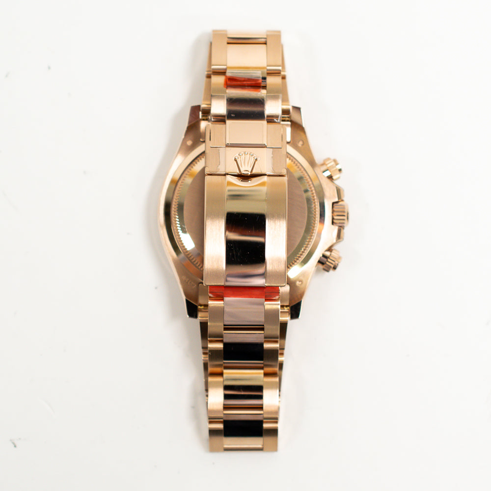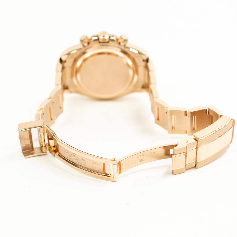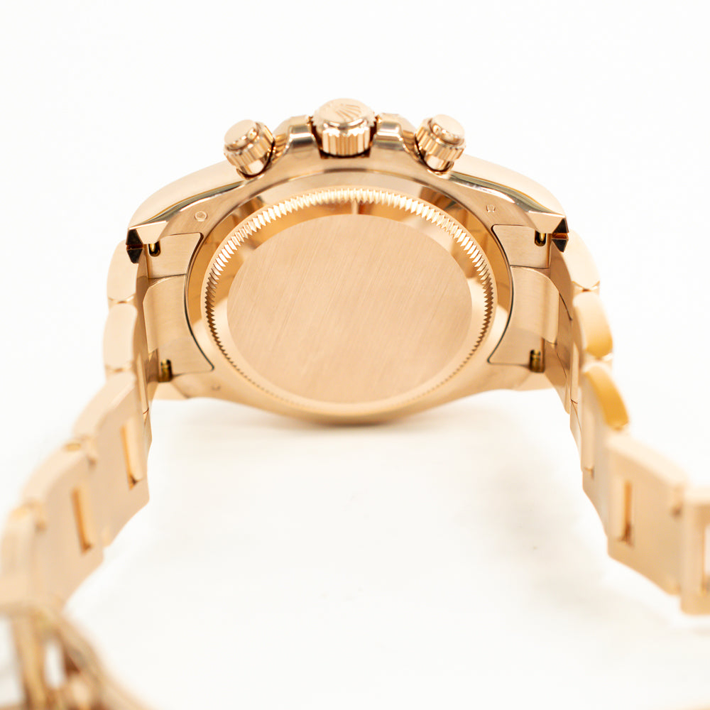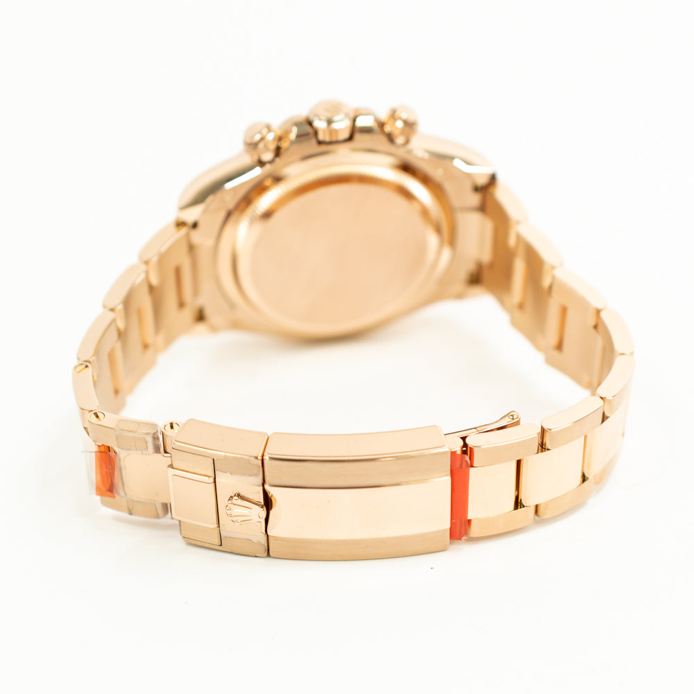 Rose gold-tone 18kt rose gold case with a rose gold-tone 18kt rose gold oyster bracelet. Fixed tachymeter scale rose gold-tone 18kt rose gold bezel. Black dial with rose gold-tone hands and index hour markers. Minute markers around the outer rim. Dial Type: Analog. Luminescent hands and markers. Chronograph - three sub-dials displaying: 60 second, 30 minute and 12 hour. Rolex Calibre 4131 automatic movement with a 72-hour power reserve. Scratch resistant sapphire crystal. Screw down crown. Solid case back. Round case shape, case size: 40 mm. Fold over clasp with a safety release. Water resistant at 100 meters / 330 feet. Functions: chronograph, hour, minute, second.
