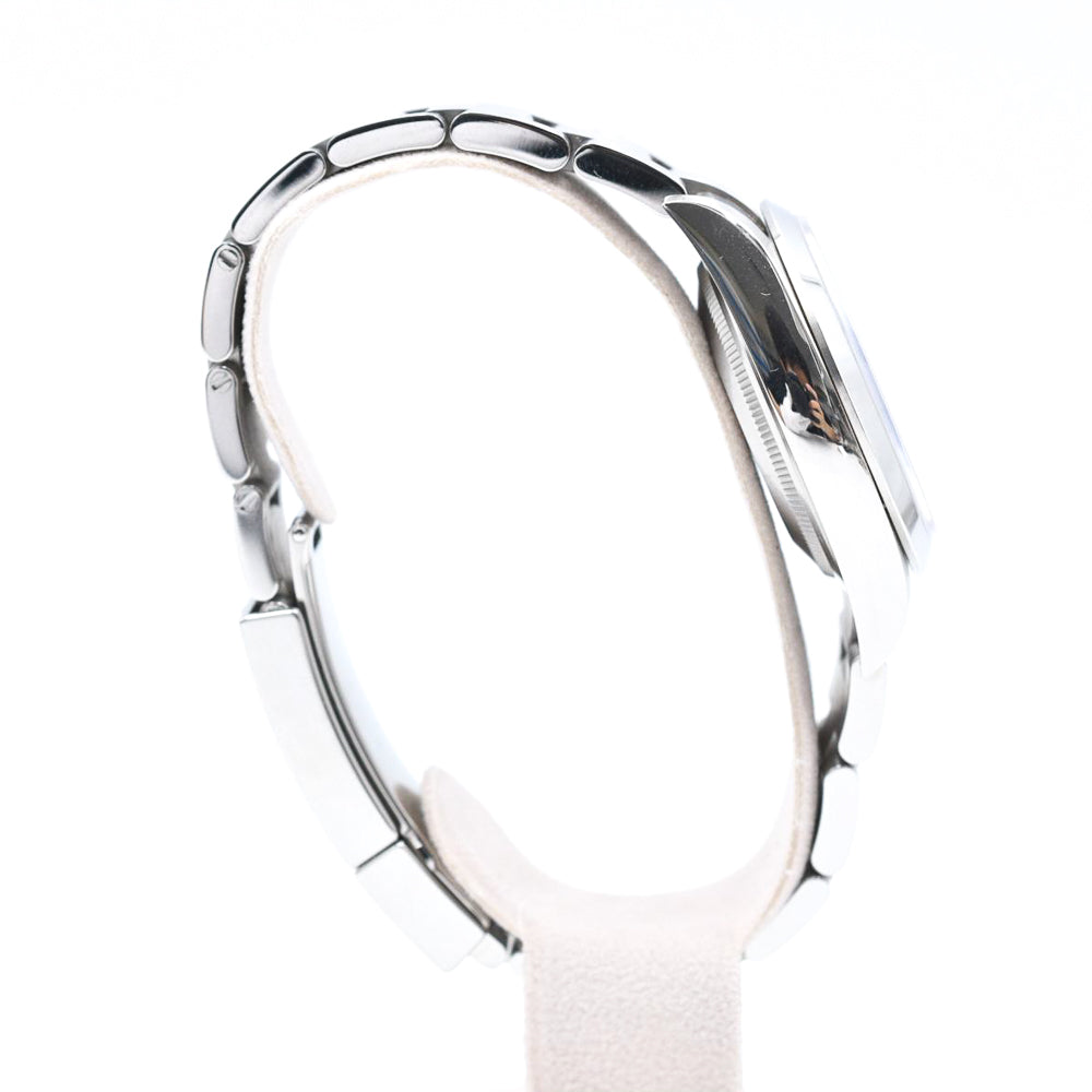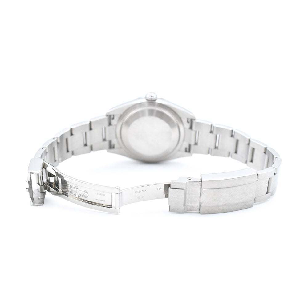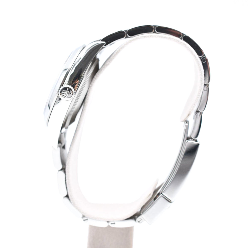 Stainless steel case with a stainless steel bracelet. Fixed stainless steel bezel. Black dial with luminous silver-tone hands and index hour markers. Arabic numerals appear at the 3, 6 and 9 o'clock positions. Minute markers around the outer rim. Dial Type: Analog. Rolex calibre 3230 automatic movement, containing 31 Jewels, bitting at 28800 vph, and has a power reserve of approximately 70 hours. Scratch resistant sapphire crystal. Screw down crown. Solid case back. Round case shape. Case size: 36 mm. Oysterlock clasp. Water resistant at 100 meters / 330 feet. Functions: hour, minute, second, chronometer.