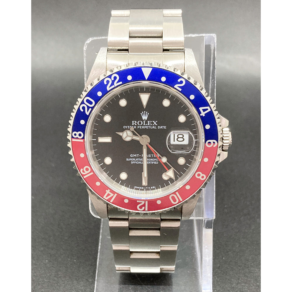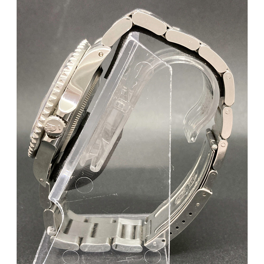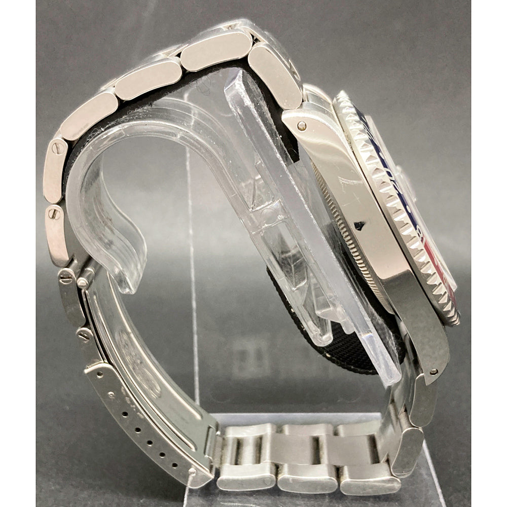 Silver-tone stainless steel case with a silver-tone stainless steel oyster bracelet. Bi-directional rotating stainless steel bezel. Black dial with silver-tone hands and index hour markers. Minute markers around the outer rim. Dial Type: Analog. Luminescent hands and markers. Date display at the 3 o'clock position. Rolex Calibre 3175 Automatic movement, containing 31 Jewels, bitting at 28800 vph, and has a power reserve of approximately 48 hours. Scratch resistant sapphire crystal. Screw down crown. Solid case back. Round case shape, case size: 40 mm. Fold over clasp with a safety release. Water resistant at 100 meters / 330 feet. Functions: date, GMT, second time zone, hour, minute, second. Gmt-master "pepsi" Series. Casual watch style. Watch label: Swiss Made.