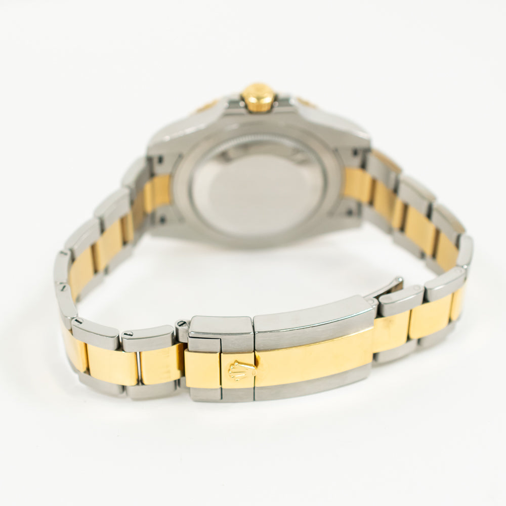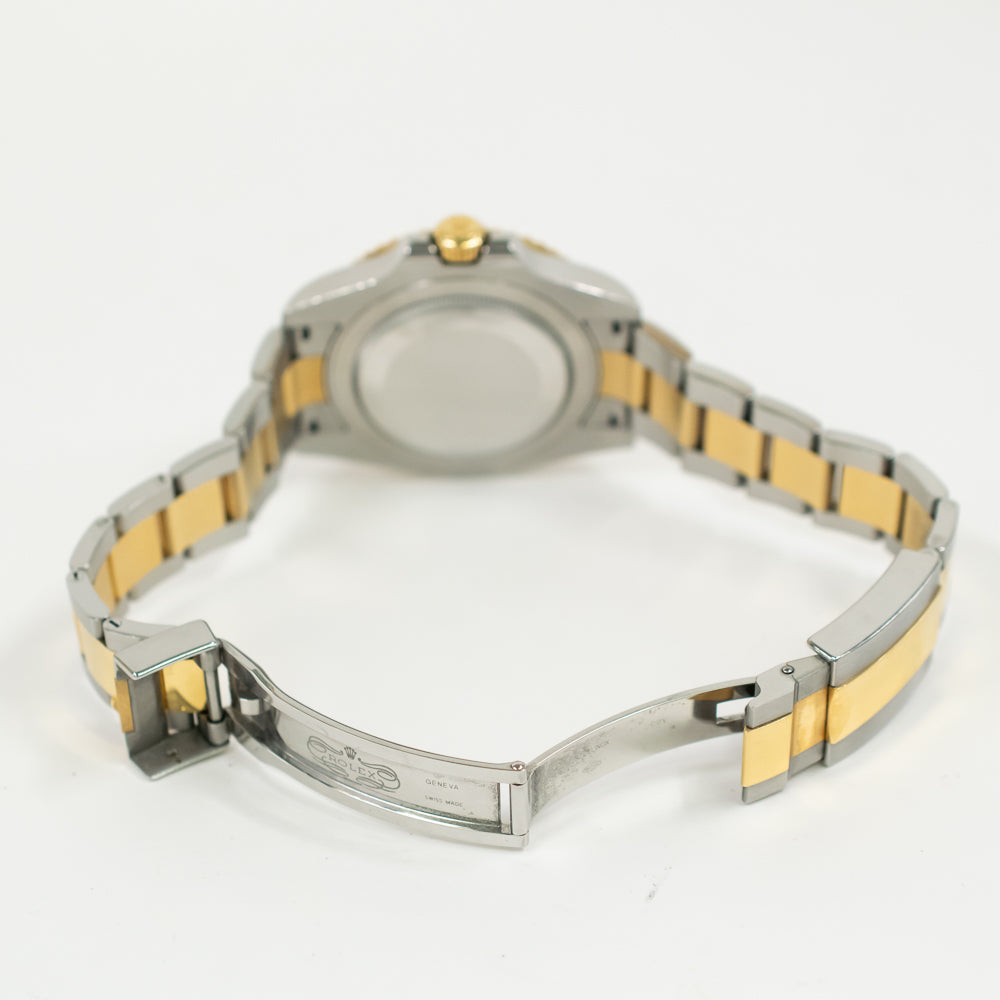 Stainless steel case with a stainless steel Rolex oyster bracelet with 18kt yellow gold center links. Bi-directional rotating 18kt yellow gold bezel with a black ceramic ring. Black dial with yellow gold Mercedes-logo, sword, and Breguet-style shape hands and dot hour markers. Minute markers around the outer rim. Dial Type: Analog. Luminescent hands and markers. Date display at the 3 o'clock position. Rolex calibre 3186 automatic movement with a 50-hour power reserve. Scratch resistant sapphire crystal. Screw down crown. Solid case back. Round case shape. Case size: 40 mm. Case thickness: 12 mm. Band width: 16 mm. Oysterlock clasp. Water resistant at 100 meters / 330 feet. Functions: GMT, second time zone, date, hour, minute, second, chronometer. Casual watch style. Watch label: Swiss Made.