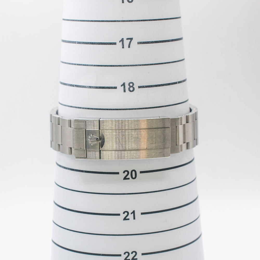 Stainless steel case with a stainless steel Rolex oyster bracelet. Uni-directional rotating stainless steel bezel with a black ceramic ring. Black dial with luminous silver-tone hands and dot hour markers. Minute markers around the outer rim. Dial Type: Analog. Luminescent hands and markers. Date display at the 3 o'clock position. Rolex calibre 3235 automatic movement with a 70-hour power reserve. Scratch resistant sapphire crystal. Screw down crown. Titanium case back. Round case shape. Case size: 44 mm. Oysterlock clasp. Water resistant at 3900 meters / 12800 feet. Functions: date, hour, minute, second. Luxury watch style. Watch label: Swiss Made.