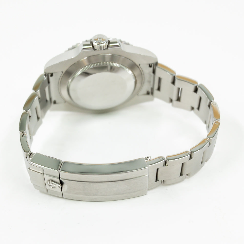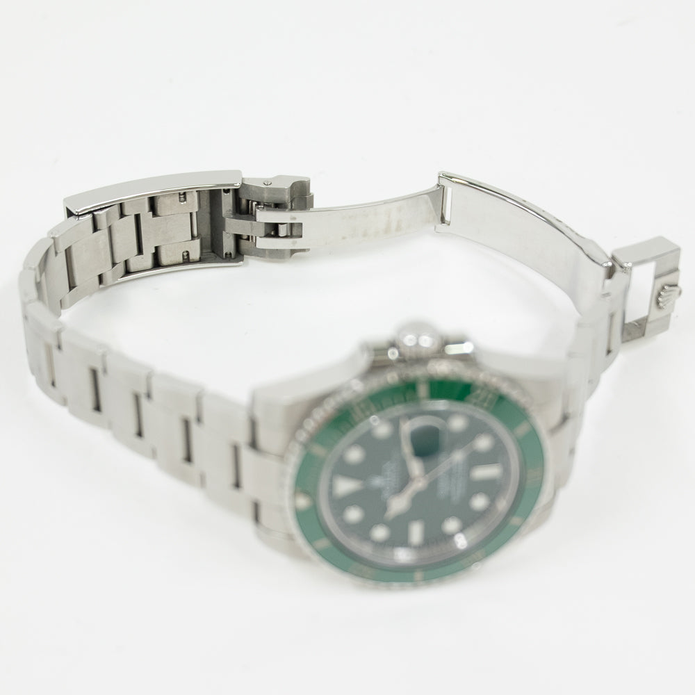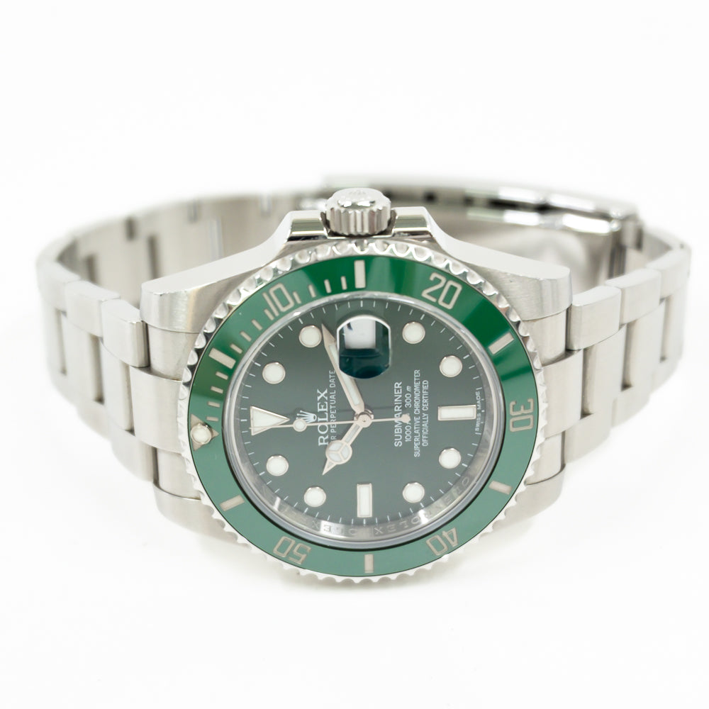 Dial: Green "Hulk" dial with white luminescent Mercedes hands and dot hour markers. Luminescent lollipop-tipped centre seconds hand. Outer stick minute markers. Date calendar at the 3 o'clock aperture.