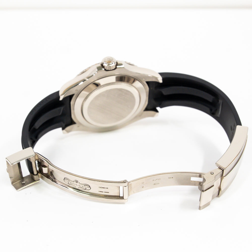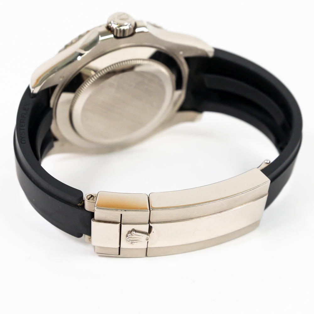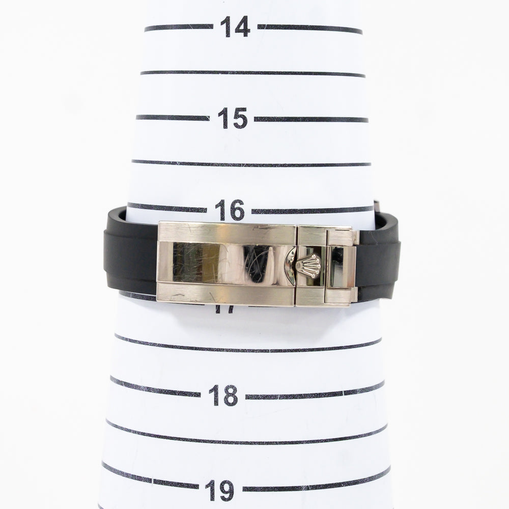 Bracelet: Black Oysterflex rubber strap with an 18k white gold flip-lock clasp.