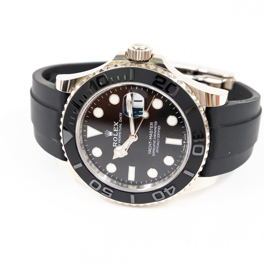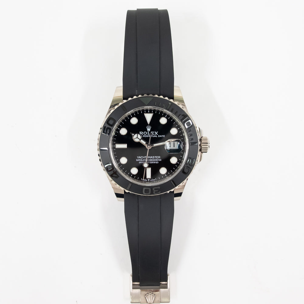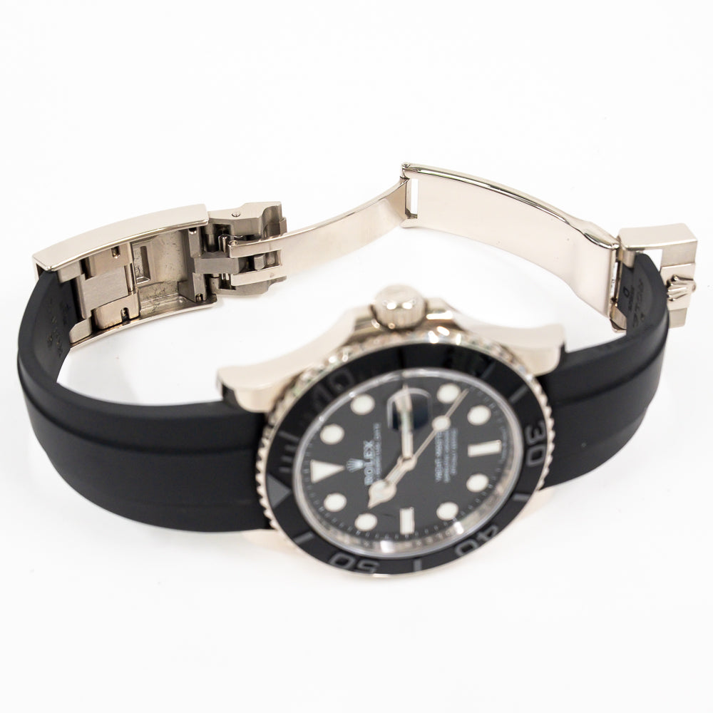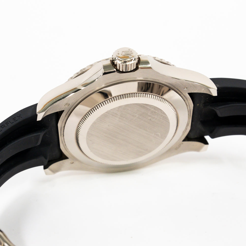 Bracelet: Black Oysterflex rubber strap with an 18k white gold flip-lock clasp.