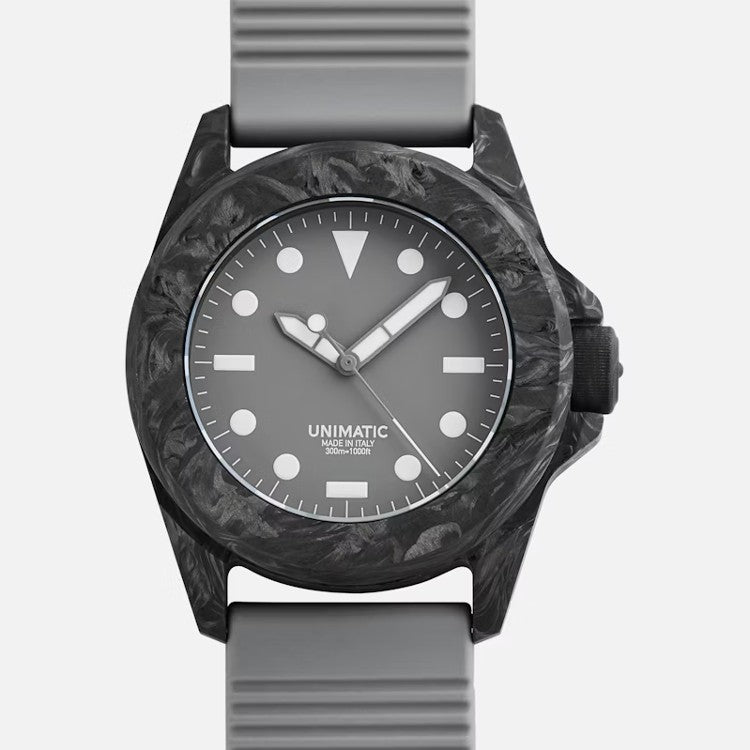 Grey carbon fiber case with a asphalt gray tpu band. Grey carbon fiber bezel. Grey dial with grey hands and index hour markers. Minute markers around the outer rim. Dial Type: Analog. Automatic movement with a 41-hour power reserve. Scratch resistant sapphire crystal. Screw down crown. Round case shape, case size: 40 mm, case thickness: 12.4 mm. Band width: 22 mm. Buckle clasp. Water resistant at 300 meters / 1000 feet. Functions: hour, minute, second.