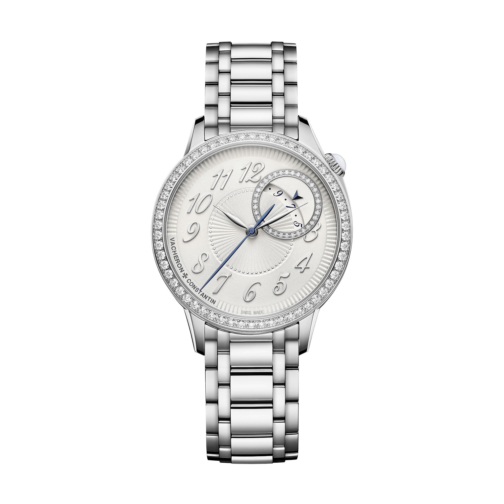 Authentic Vacheron Constantin Egerie Self-Winding Silver Dial Diamond Steel Men's Watch Model 4605F/110A-B495. Stainless Steel case with Stainless Steel watch band. Diamond Set bezel. Dial description: Silver tone hands and Arabic Numeral hour markers on a Silver dial. Automatic Self Winding movement. Watch functions: Hour, Minute, Second, Date. Scratch Resistant Sapphire crystal. Round case shape. Case size: 35mm. Case thickness: 9.32mm. 30 Meters - 100 Feet water resistant.